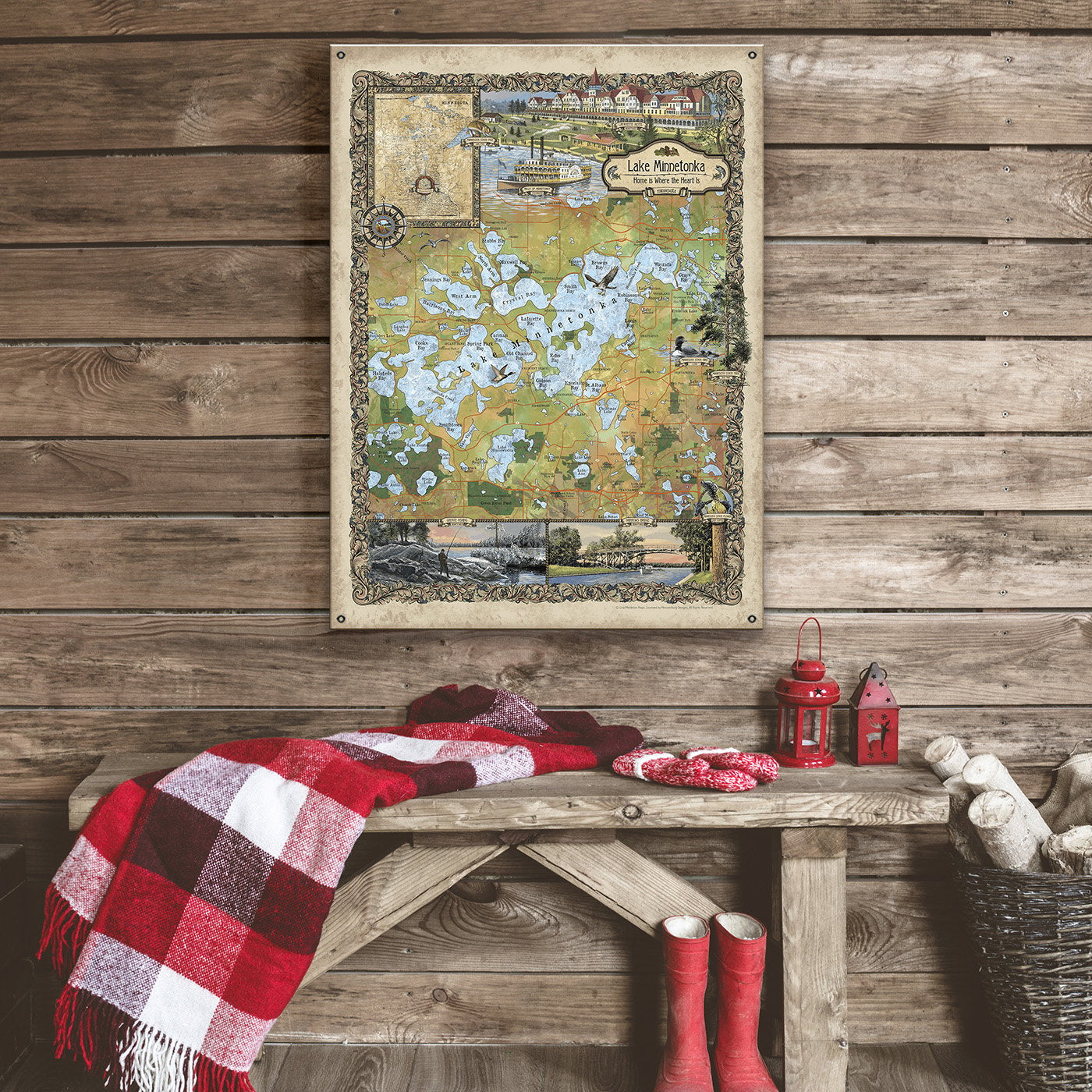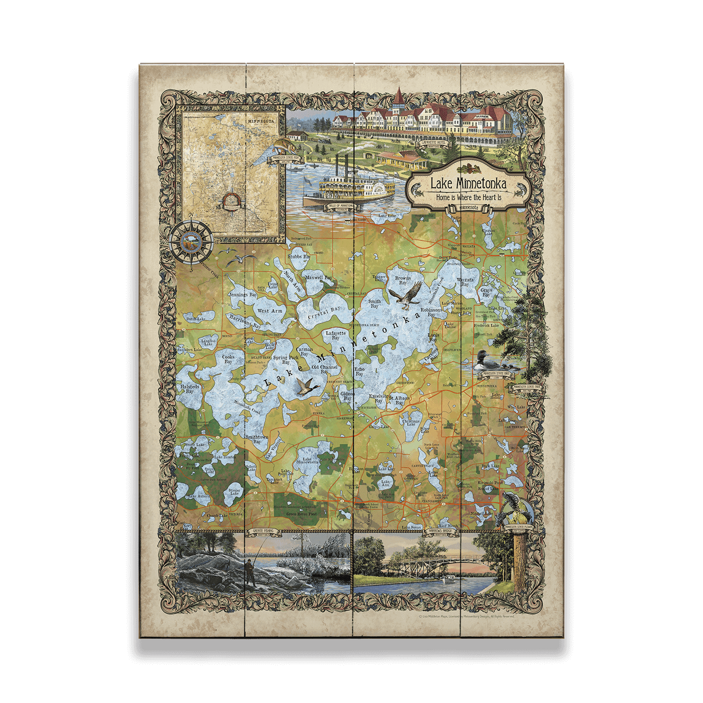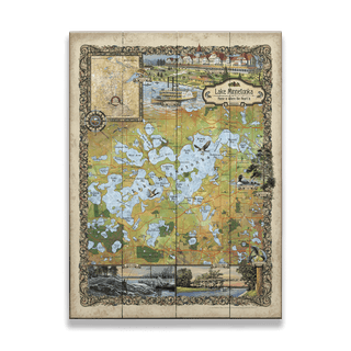 Step back in time with the "Lake Minnetonka, Minnesota" map, a stunning artistic rendition by Lisa Middleton. This hand-painted map captures the historic charm and natural beauty of Lake Minnetonka, known for its sprawling waterfront and vibrant local life. Featuring detailed depictions of the lake's islands and bays, alongside illustrations of significant landmarks and scenes of past leisure, this piece is a treasure trove for both map enthusiasts and lovers of Minnesota's lakeside heritage. This stunning piece of wall art is the perfect way to bring a touch of the Big Waters into your home.