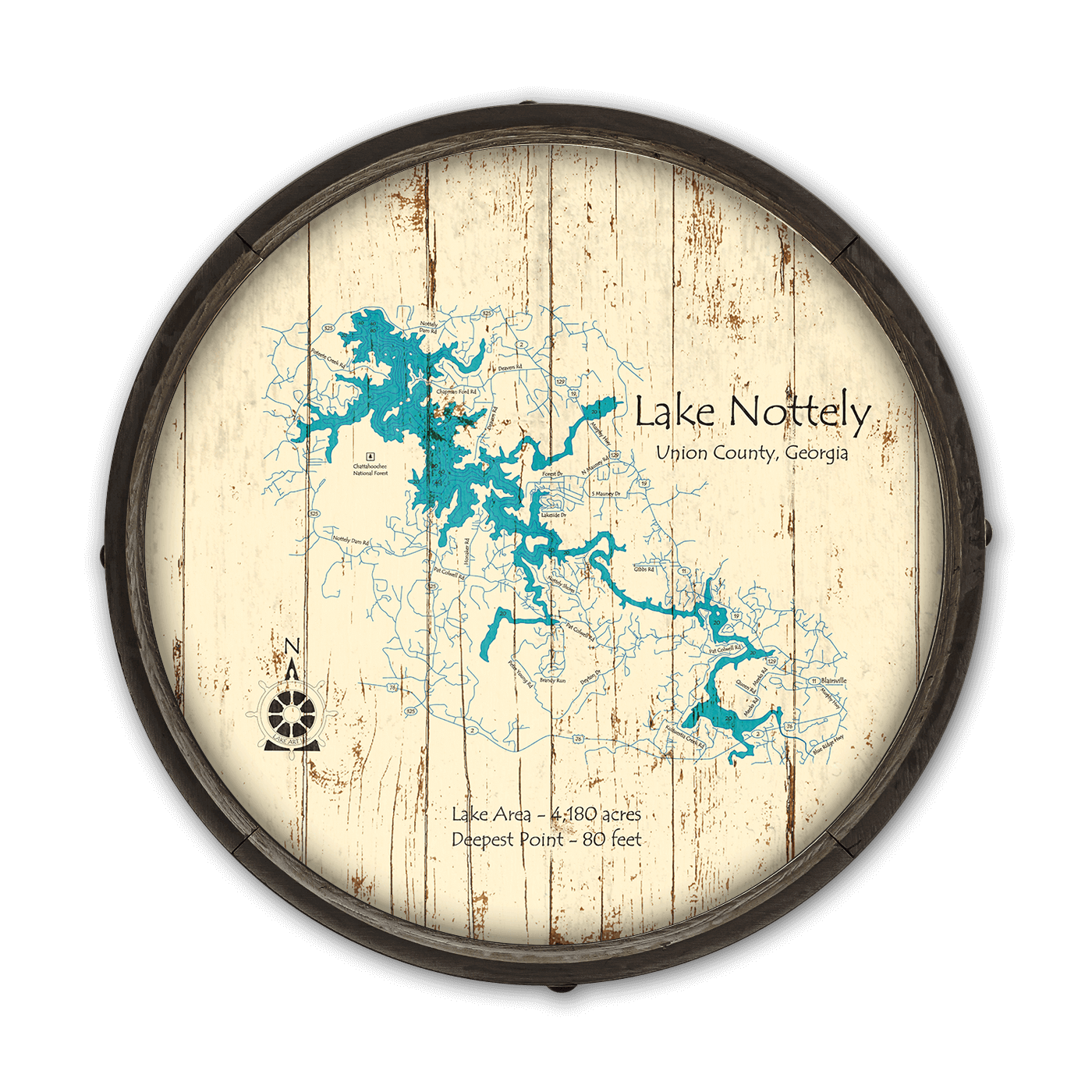Introducing our exquisite decorative map showcasing the stunning Lake Nottely - a reservoir of the renowned Tennessee Valley Authority. Situated entirely within the picturesque Union County, Georgia, and surrounded by the lush Chatahoochee-Oconee National Forests, this map perfectly captures the beauty of this iconic location.