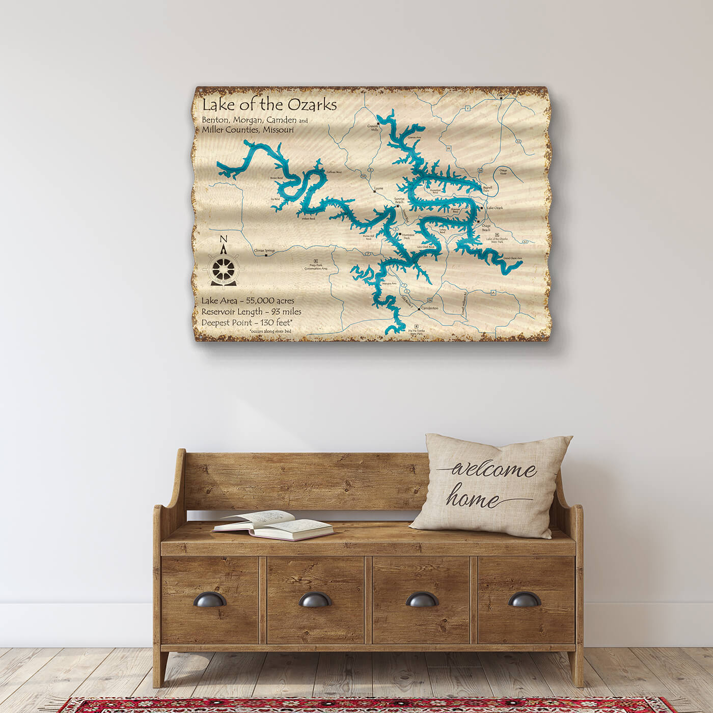 Introducing our vintage-style map of Lake of the Ozarks - one of the most coveted lake destinations in the Midwest! This stunning map perfectly captures the charm and allure of this iconic location. The crystal-clear waters of Lake of the Ozarks are perfect for a wide range of outdoor activities, while the surrounding area boasts excellent golf courses, shopping centers, and relaxation spots that are ideal for spending time with friends and family. Lake Ozark is also home to the legendary Magic Dragon Street Meet, an annual car show that has captivated visitors for generations.