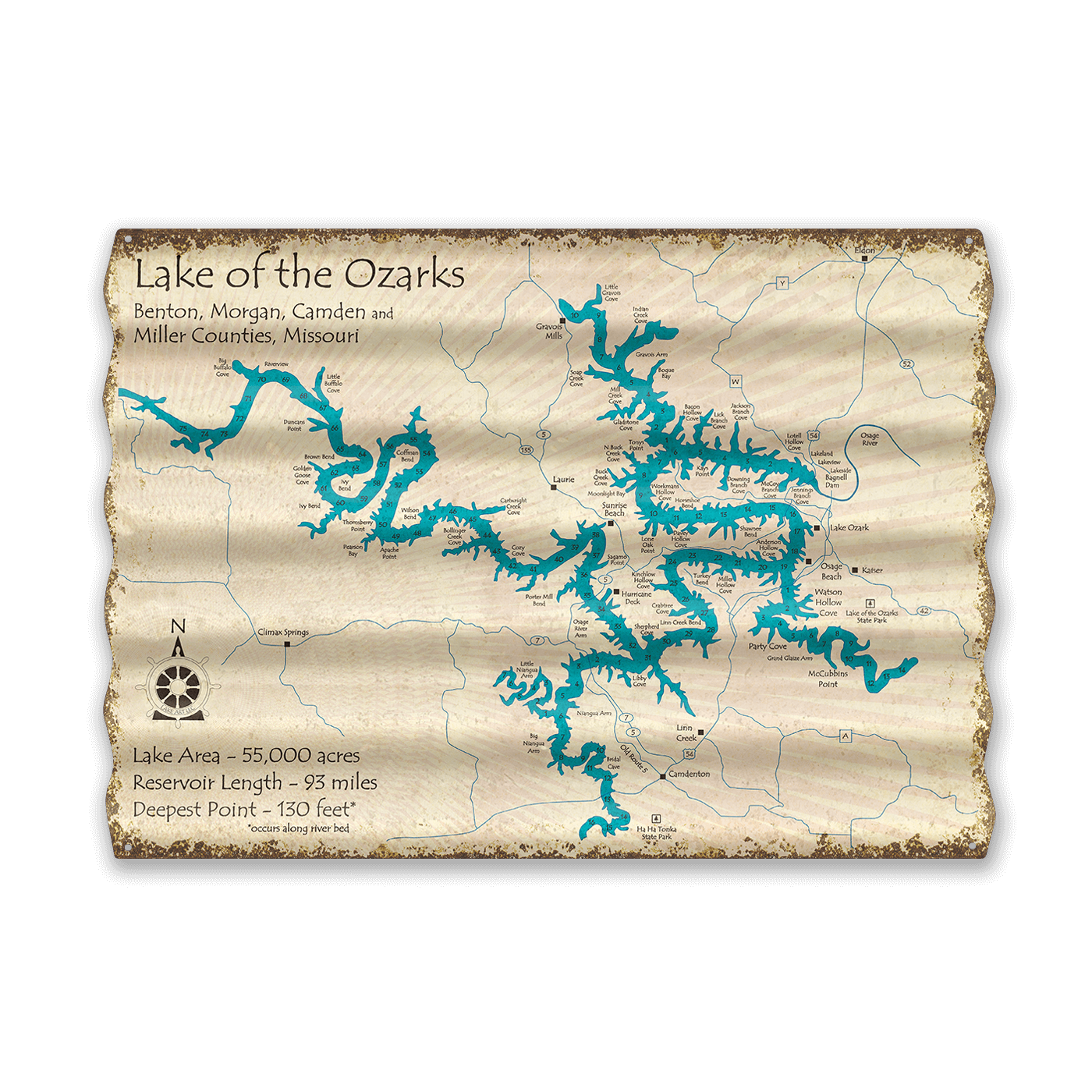 Introducing our vintage-style map of Lake of the Ozarks - one of the most coveted lake destinations in the Midwest! This stunning map perfectly captures the charm and allure of this iconic location. The crystal-clear waters of Lake of the Ozarks are perfect for a wide range of outdoor activities, while the surrounding area boasts excellent golf courses, shopping centers, and relaxation spots that are ideal for spending time with friends and family. Lake Ozark is also home to the legendary Magic Dragon Street Meet, an annual car show that has captivated visitors for generations.