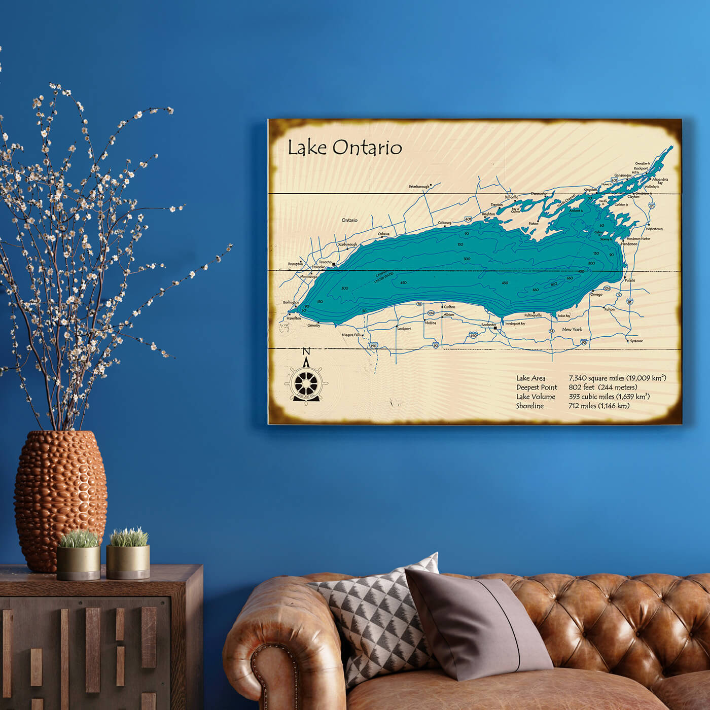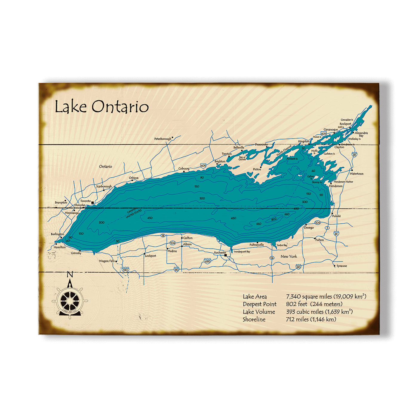 Introducing our vintage map of Lake Ontario - a stunning decorative piece that captures the essence of this breathtaking region. Ideal for those seeking a touch of rustic charm or a unique piece of history for their collection. The Lake Ontario region is famous for its stunning scenic views, from the vast blue waters of the lake to the rolling hills that surround it to the lighthouses that dot the shoreline. Outdoor enthusiasts can indulge in a wide variety of recreational activities at Lake Ontario, making it an ideal location for families and adventurers alike.
