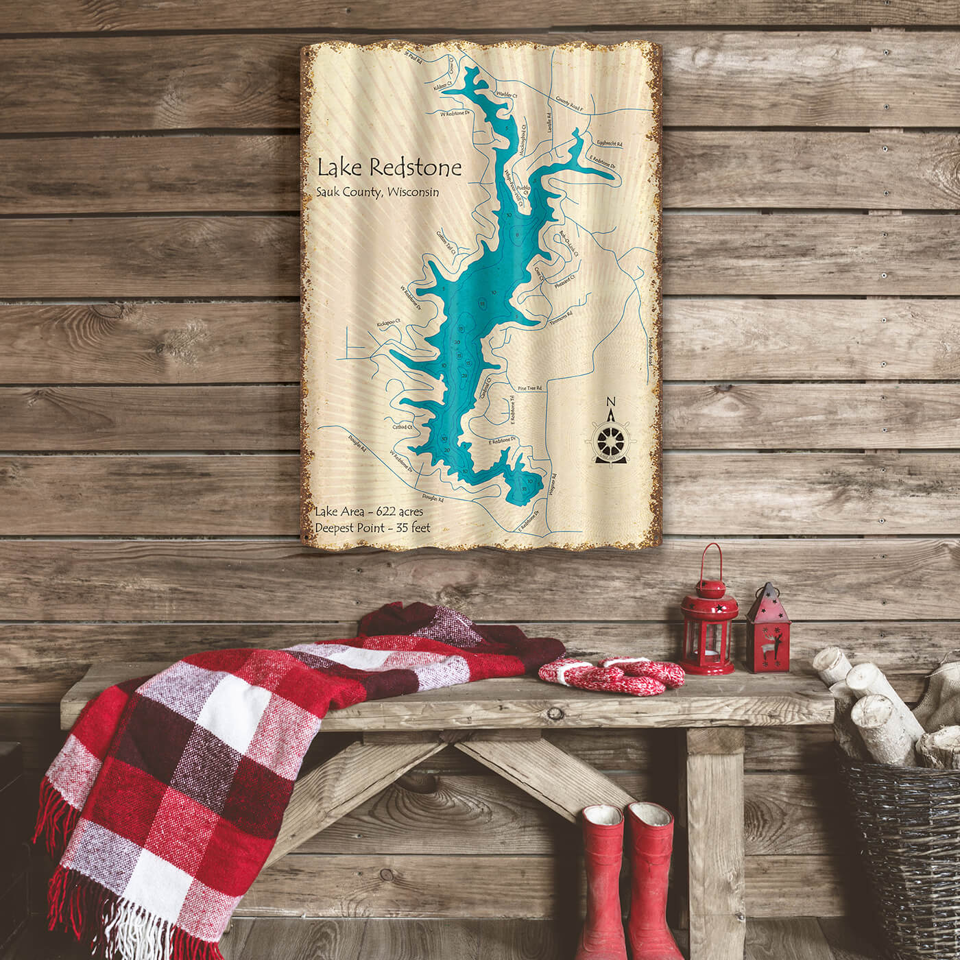 Discover the intricate beauty and natural allure of Lake Redstone, captured in this detailed, vintage-style map. Situated in the heart of Sauk County, Wisconsin, this cartographic artwork showcases the contours and depths of the beloved waterway.