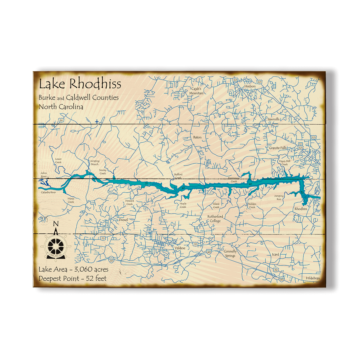 Immerse yourself in the serene beauty of North Carolina with our meticulously crafted Lake Rhodhiss Map. Nestled within Burke and Caldwell Counties, Lake Rhodhiss stands as a picturesque gem, known for its crystal-clear waters and tranquil setting. Our map starts where the Catawba River feeds into the lake, captures the expansive shoreline, and ends at Rhodhiss. The map also features local landmarks like the charming towns of Granite Falls and Valdese, rich in history and culture. Perfect for outdoor enthusiasts and lovers of the Carolinas' natural landscapes, our Lake Rhodhiss Map is not just a piece of art; it's a tribute to the peaceful, yet vibrant spirit of this beloved North Carolina lake.