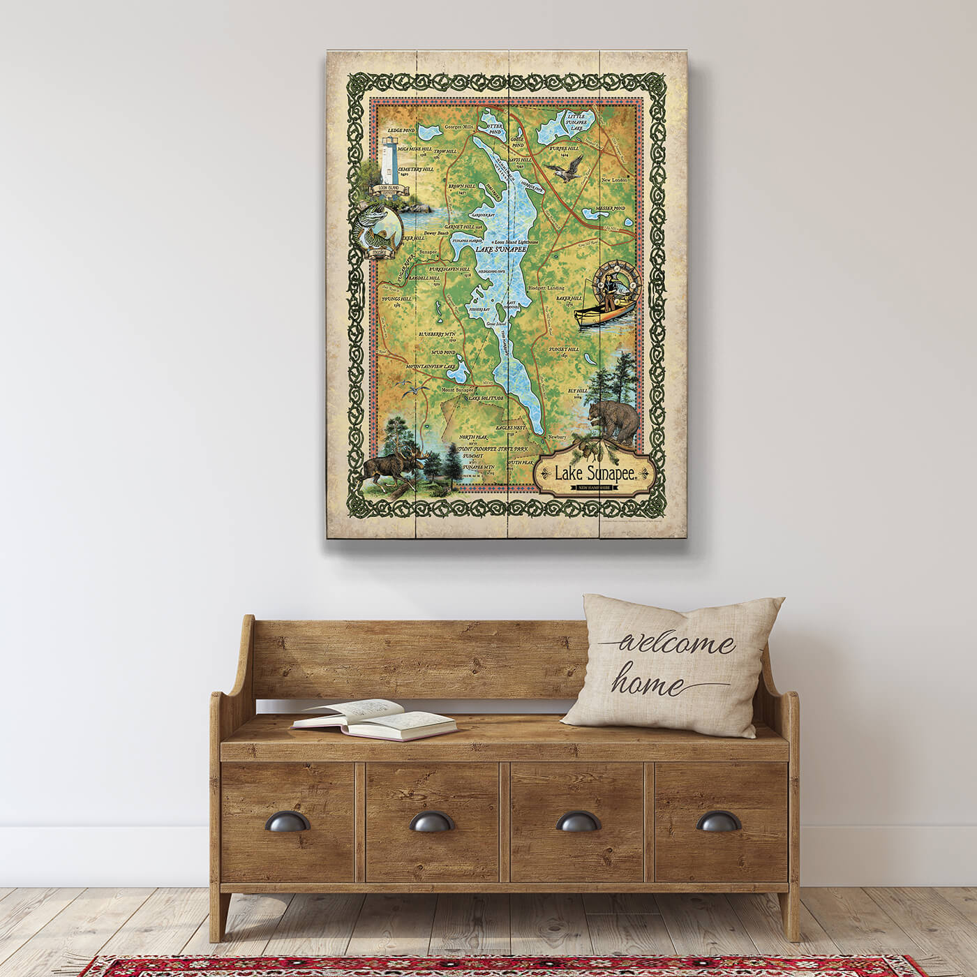 Lake Sunapee, New Hampshire: Illustrated Map - Wood & Metal Wall Art