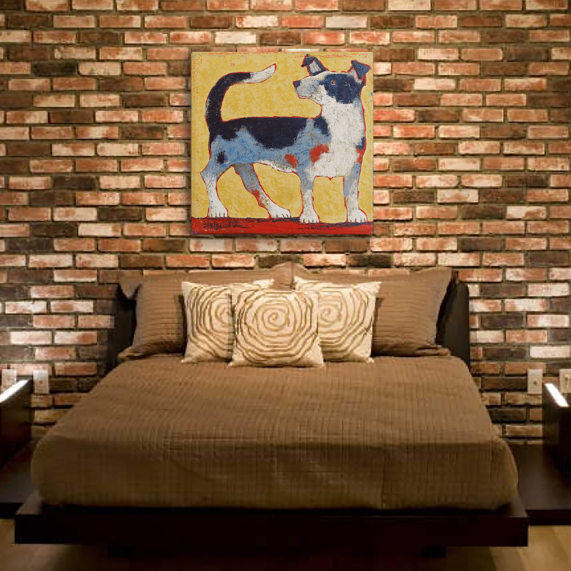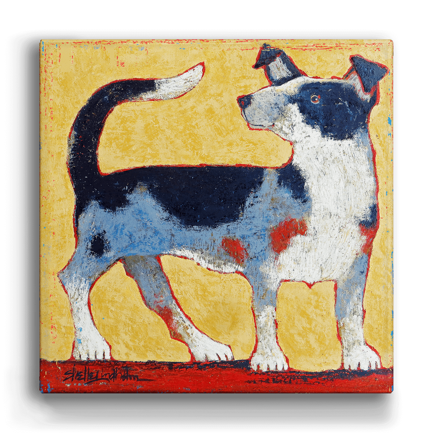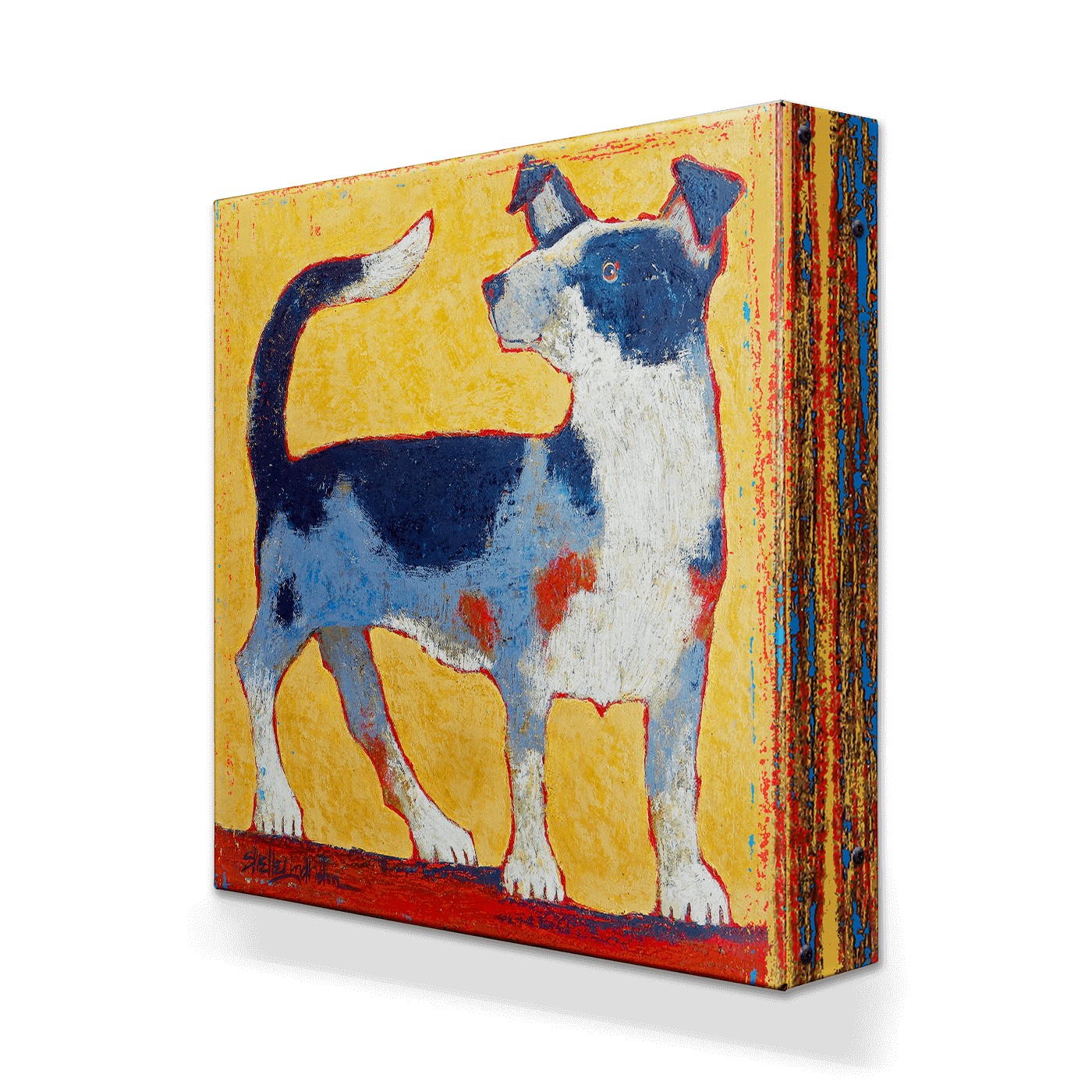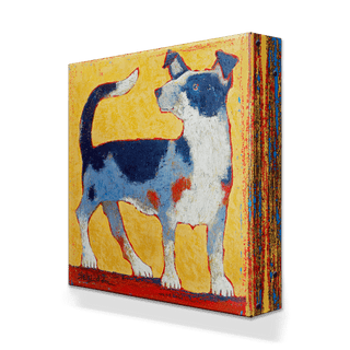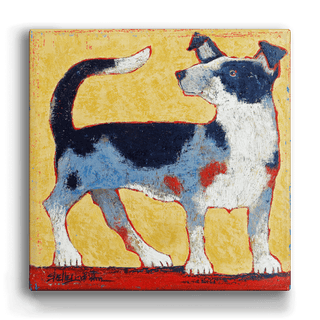 This charming artwork features a spirited dog in bold shades of blue, white, and rust, set against a vibrant yellow background. The textured brushstrokes and rustic details give the piece a playful yet timeless appeal, capturing the loyal and curious essence of man's best friend. Perfect for pet lovers and art enthusiasts alike, this piece brings warmth and character to any space.