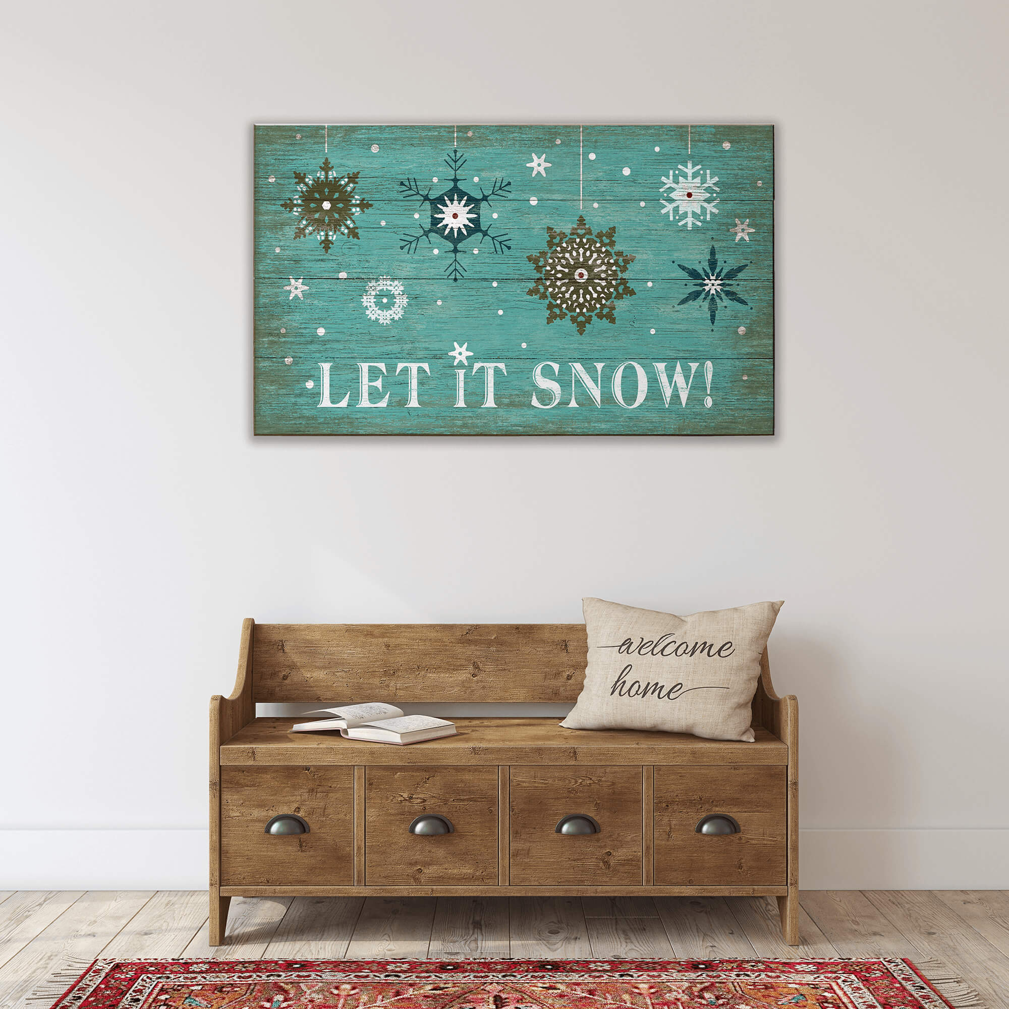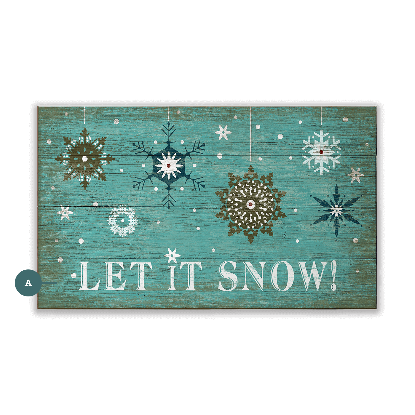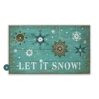 This festive artwork features a collection of intricate snowflakes set against a rustic, teal, textured background with the joyful message "Let It Snow!" The charming, vintage-inspired design adds a cozy, wintery feel to any space, making it perfect for holiday or seasonal decor. With its playful yet classic appeal, this piece is ideal for those looking to bring the beauty of winter and the spirit of the holidays into their home. Perfect for creating a warm and inviting atmosphere during the snowy season.