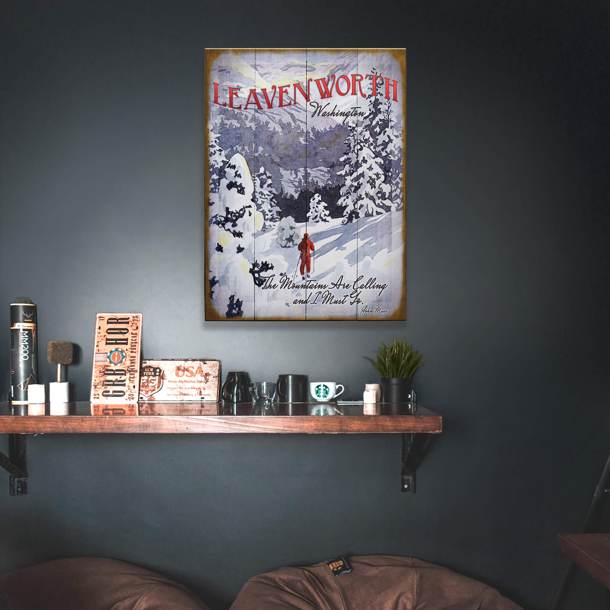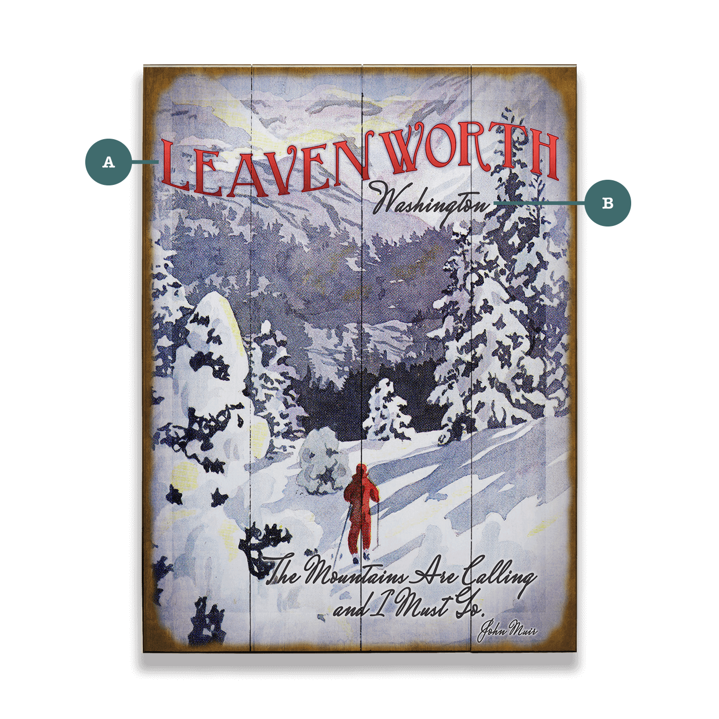 This stunning winter-themed artwork captures the serene beauty of a snow-covered mountain landscape. Featuring a skier in red gliding through a peaceful, snow-laden forest, the piece evokes a sense of adventure and tranquility. The soft, muted colors combined with the detailed illustration create a nostalgic, vintage feel, perfect for lovers of outdoor recreation and winter sports. The artwork’s weathered, retro design adds a timeless charm, making it ideal for decorating spaces with a rustic or alpine theme.