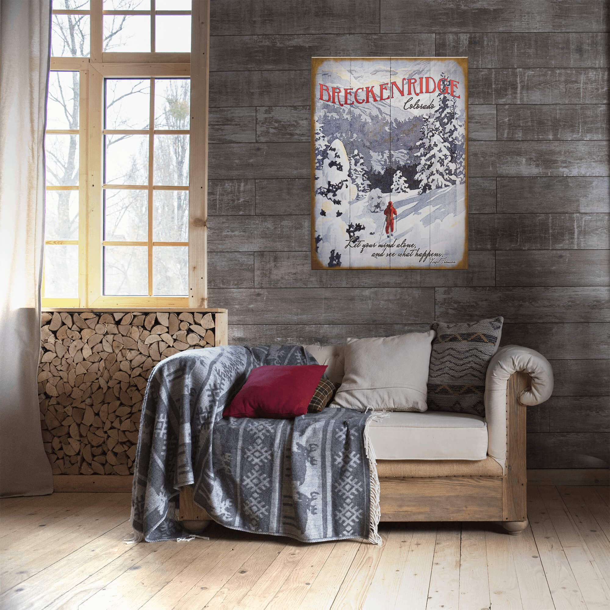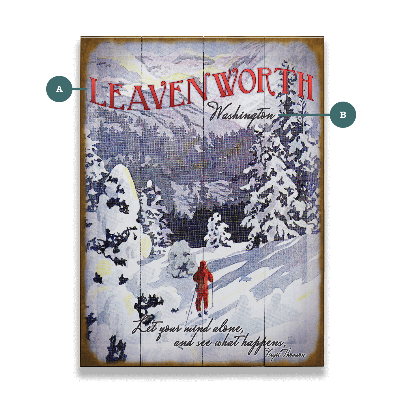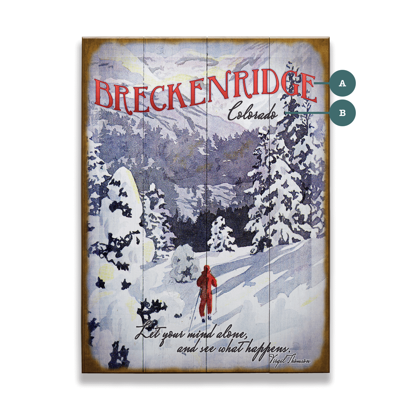 This stunning winter-themed artwork captures the serene beauty of a snow-covered mountain landscape. Featuring a skier in red gliding through a peaceful, snow-laden forest, the piece evokes a sense of adventure and tranquility. The soft, muted colors combined with the detailed illustration create a nostalgic, vintage feel, perfect for lovers of outdoor recreation and winter sports. The artwork’s weathered, retro design adds a timeless charm, making it ideal for decorating spaces with a rustic or alpine theme.
