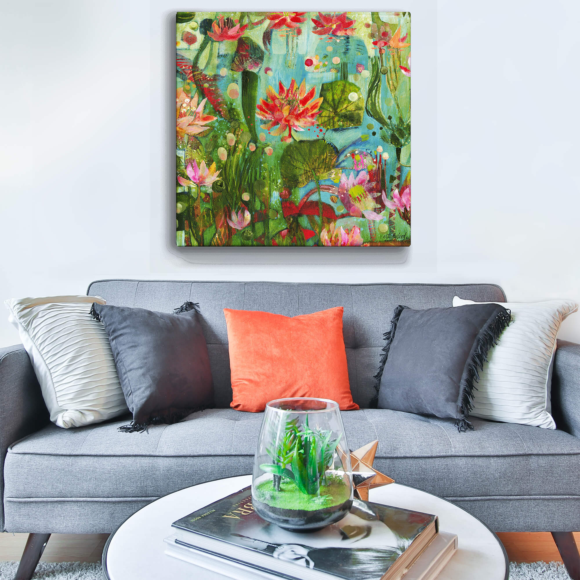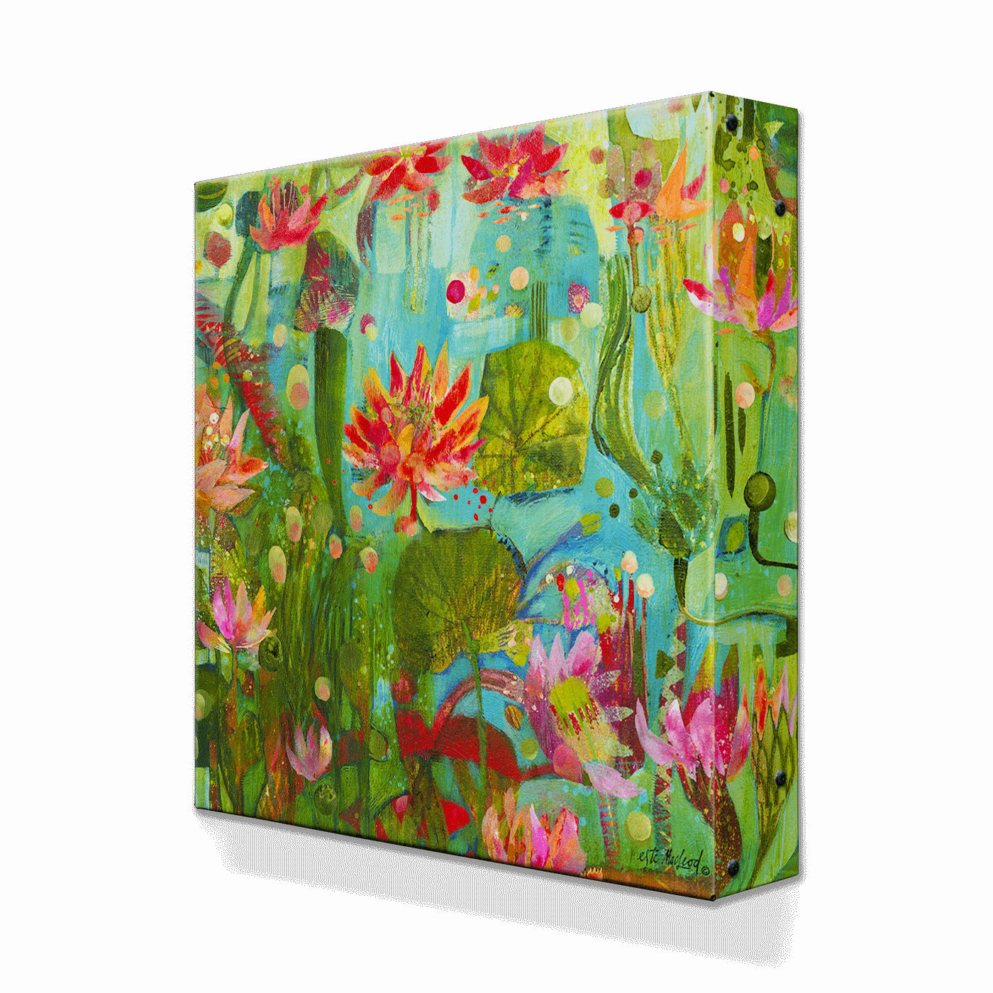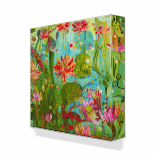 Discover the serene allure of "Lily Pond" by Este MacLeod, a box-art piece that breathes life into the tranquil beauty of water gardens. Printed on a sheet of aluminum and crafted into an elegant shallow box, this artwork embodies the perfect blend of reality and fantasy. Este’s unique vision comes to life through the stylized depiction of lily pads and blossoms, rendered in a symphony of vibrant colors and ethereal patterns. Este's work captivates with its fresh, whimsical style, making "Lily Pond" an idyllic escape for any lover of contemporary art with a touch of whimsy.