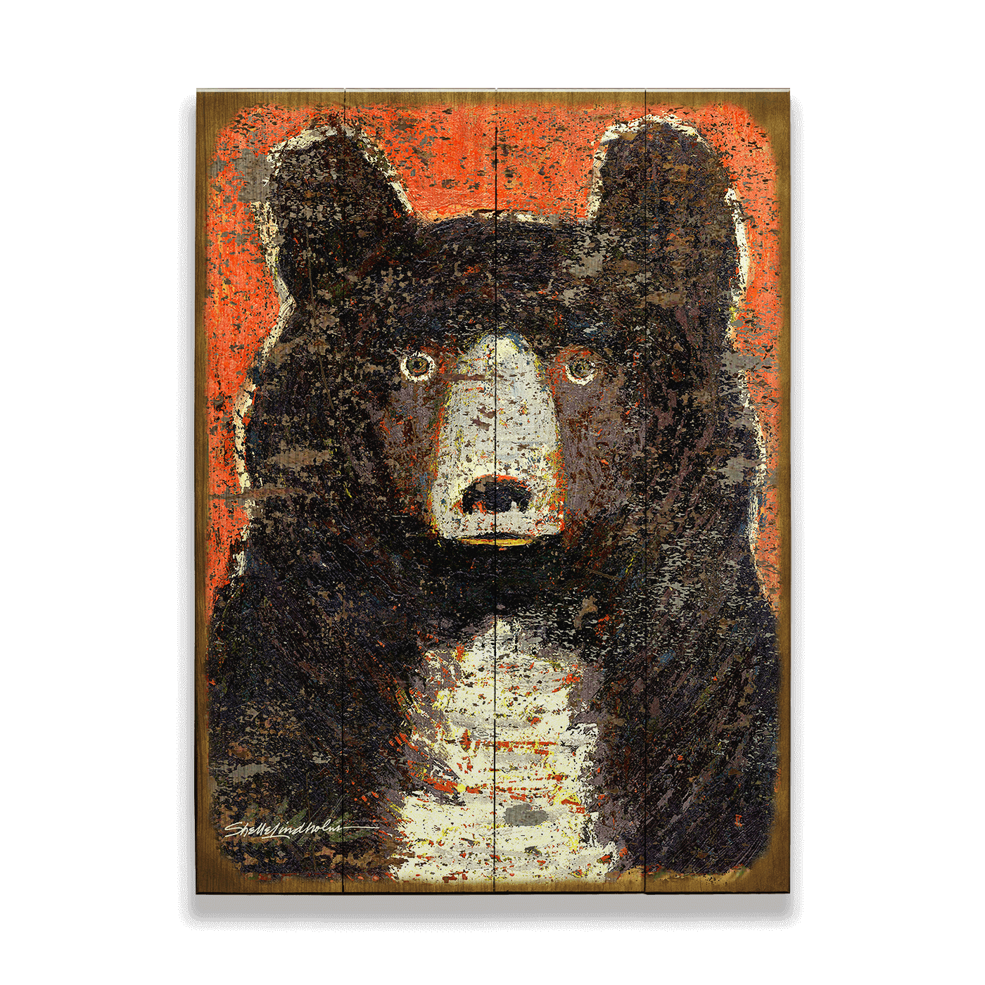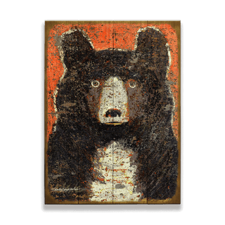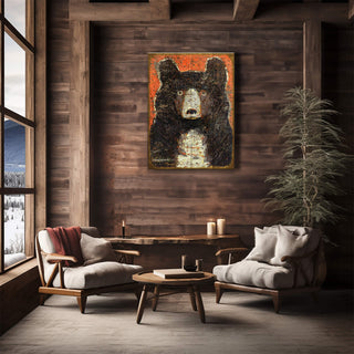 "Little Owl" presents an intriguing and textured portrait of a bear, featuring a mysterious and intense gaze that captivates the viewer. Despite the title, the artwork depicts a bear, but the name could hint at a deeper, symbolic meaning or a subtle element within the piece—perhaps suggesting the bear's wisdom or maybe the perked-up ears. This artwork uses a rich palette of dark tones contrasted against a vibrant red background, emphasizing the bear's formidable presence. Ideal for art lovers who appreciate works with a hint of mystery, "Little Owl" is a thought-provoking piece perfect for sparking conversations in any art collection.