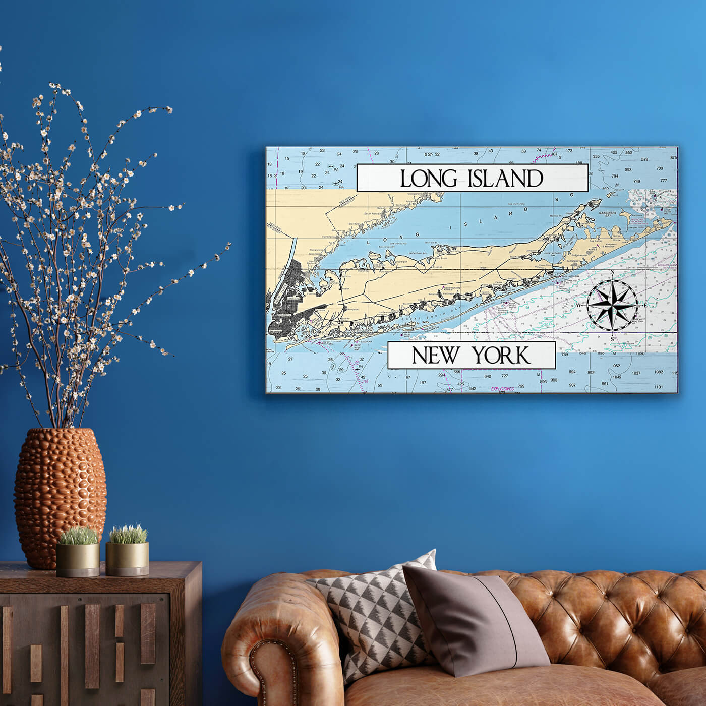 This nautical chart artwork of Long Island, New York, offers a wide view of the island’s southern coastline, showcasing key navigation routes, bays, and offshore waters. From the bustling shores near New York City to the quiet inlets of the East End, Long Island blends maritime activity with scenic beauty. It's a region known for fishing, sailing, and beach escapes—from Fire Island to Montauk. With detailed coastal markings and customizable text, this piece makes a striking tribute to a diverse and iconic stretch of the Atlantic seaboard.
