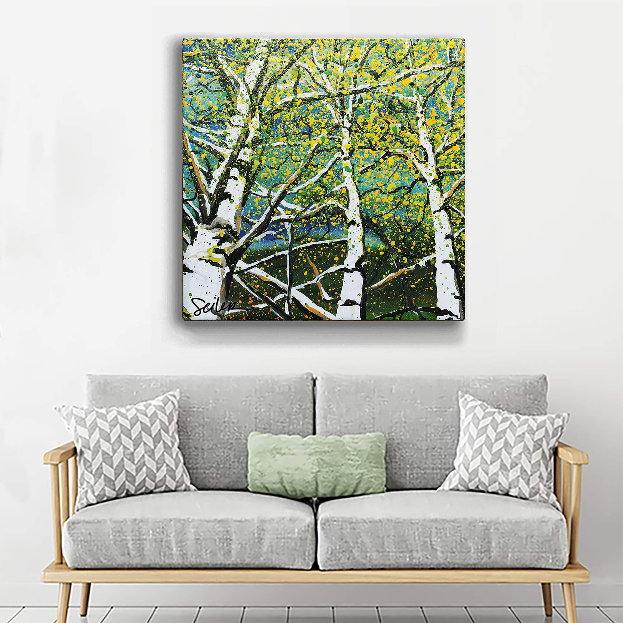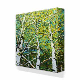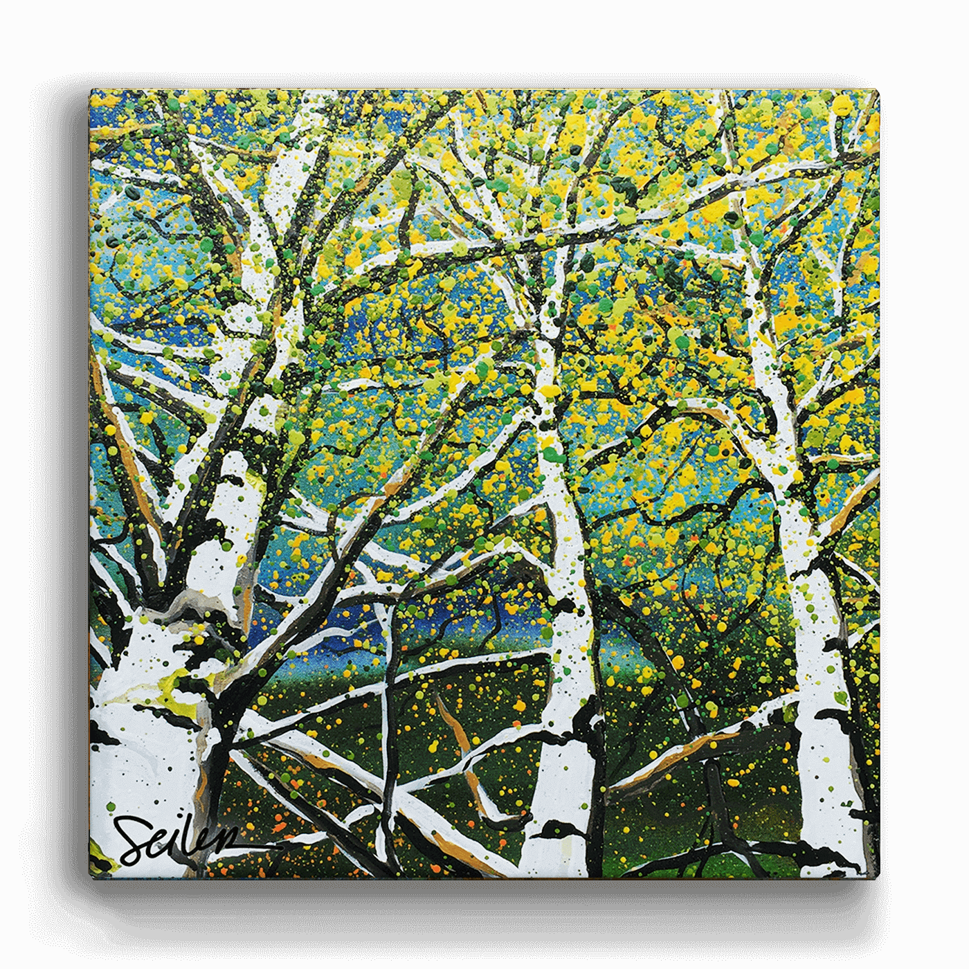 Complete your journey through the Looking Skyward series with "Looking Skyward: The Crescendo." As the final piece in the series, this artwork captures the fullness of the aspen forest canopy in a symphony of green and yellow. The stark white aspen trunks stand firm as the array of leaves above them sing with color. This piece encapsulates the peak of nature's chorus and is a testament to the beauty of looking up.