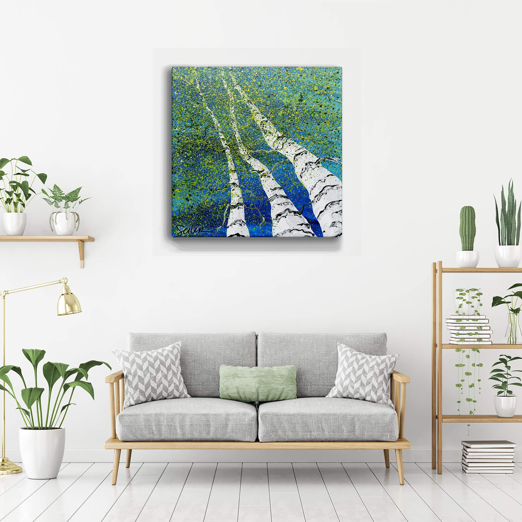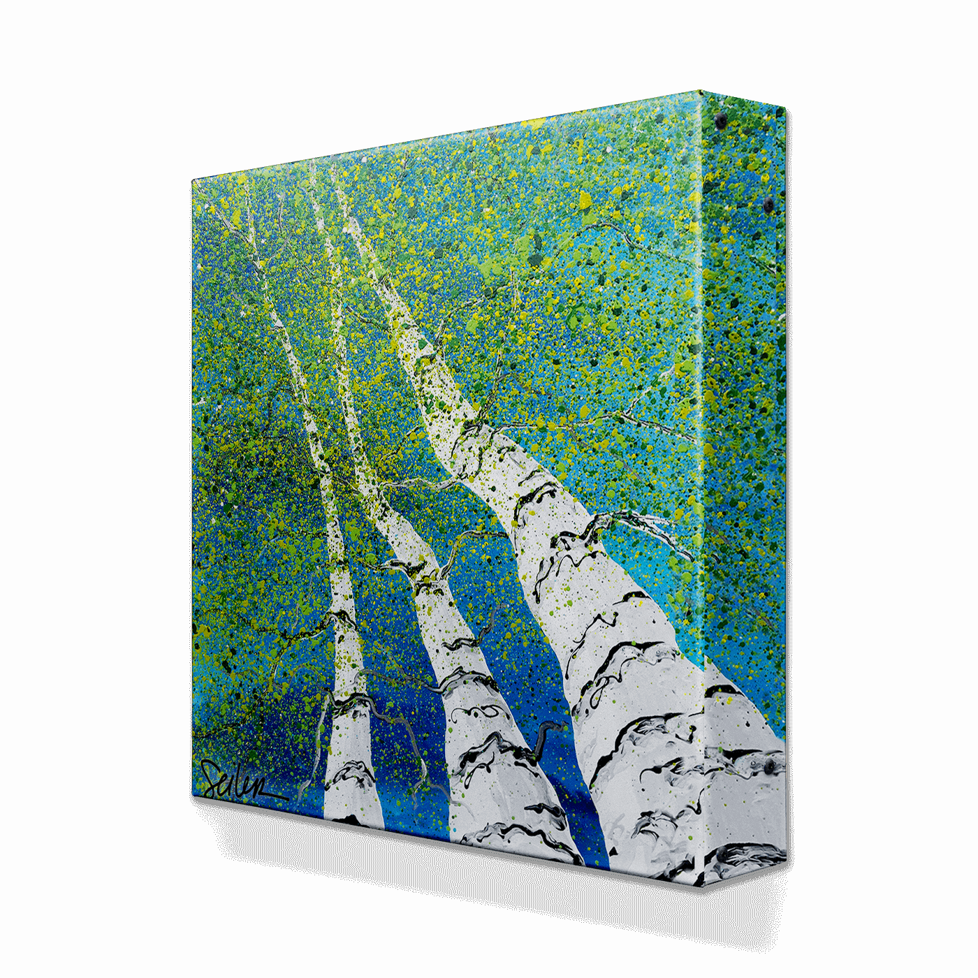 Experience the serene beauty of the aspen grove with "Looking Skyward: The First Glimpse." This artwork transports you to a tranquil forest, inviting you to gaze upwards along the elegant white trunks of aspen trees that reach towards a dynamic blue and green canopy. Splatters of vivid paint create a lively and textured portrayal of nature's splendor. This first piece in the "Looking Skyward" series sets a refreshing tone for the collection.