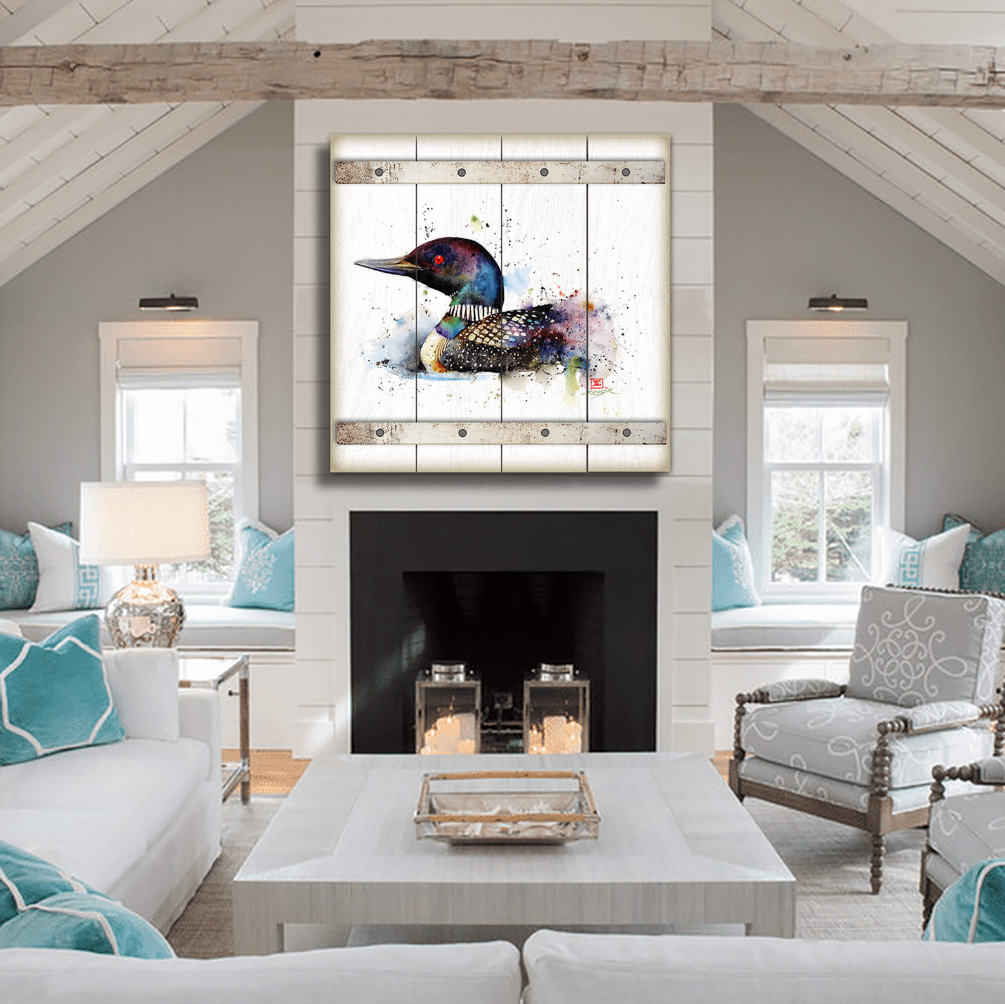 Behold the striking beauty of the wilderness captured in this watercolor painting of a loon. With its vivid, piercing red eye and intricately detailed plumage, this artwork embodies the serene yet spirited essence of this iconic water bird. The dynamic splashes of color around the loon add a vibrant, almost ethereal quality to the painting, making it a stunning addition to any collection. Ideal for birdwatchers and nature lovers, this piece brings the tranquil allure of lakeside mornings directly into your home or office.