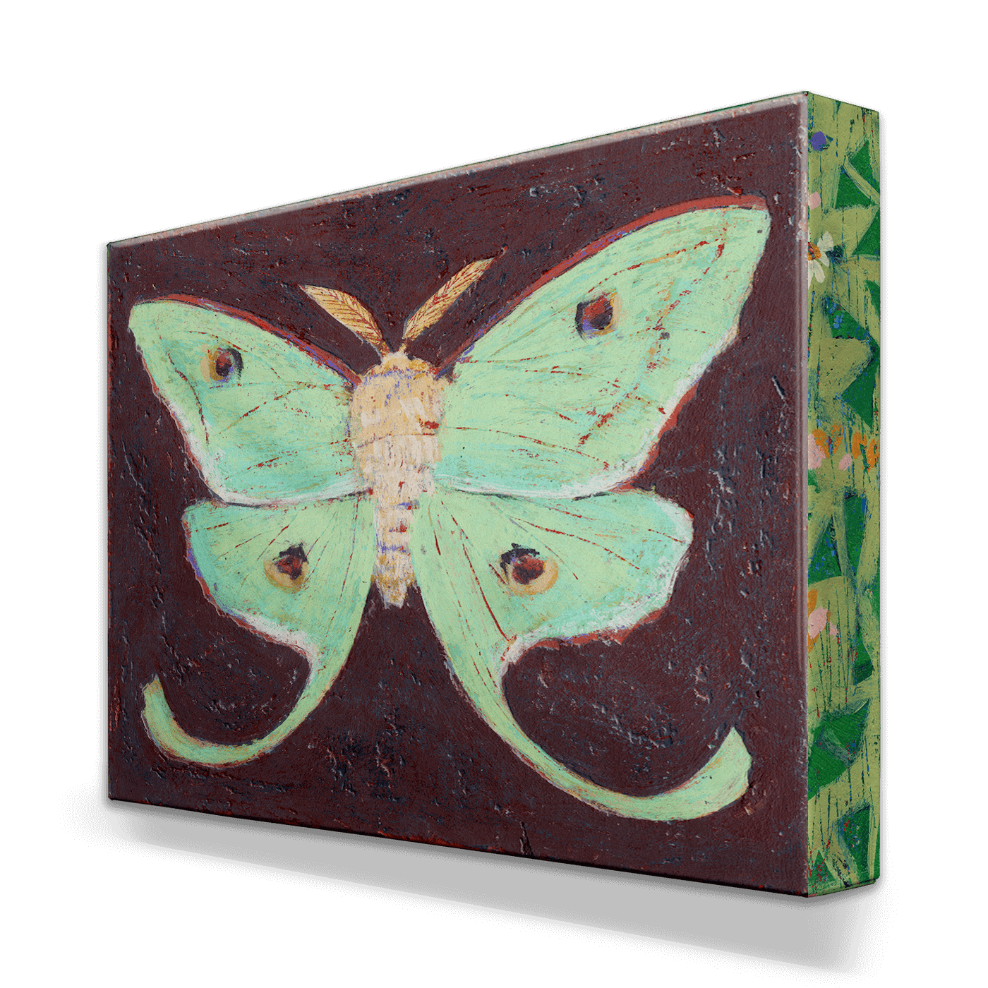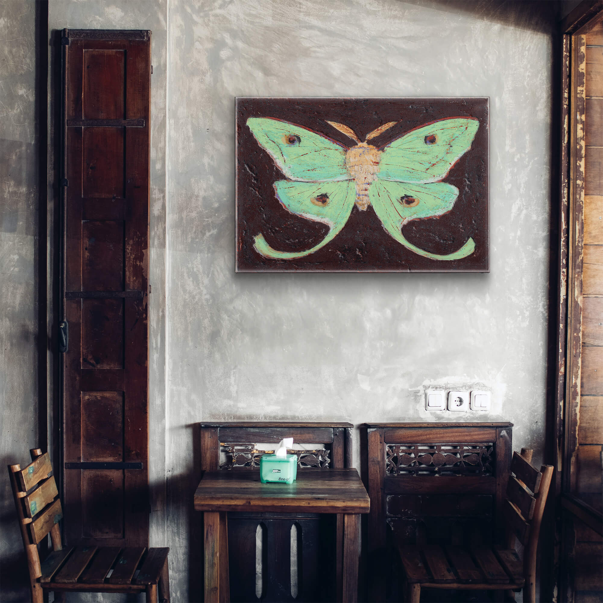 Elevate your space with this stunning artwork showcasing a vibrant luna moth in striking mint green tones against a rich, textured dark background. The delicate details and symmetrical composition celebrate the beauty and elegance of this nocturnal creature. Perfect for nature enthusiasts or anyone seeking a unique and eye-catching piece, this artwork adds a touch of mystery and sophistication to any room.