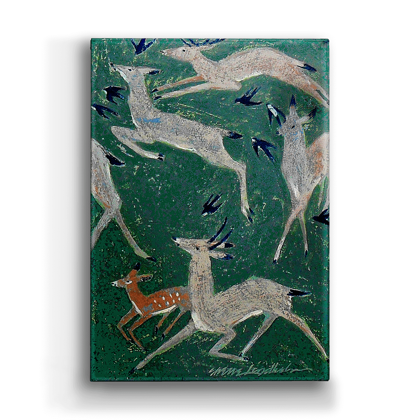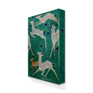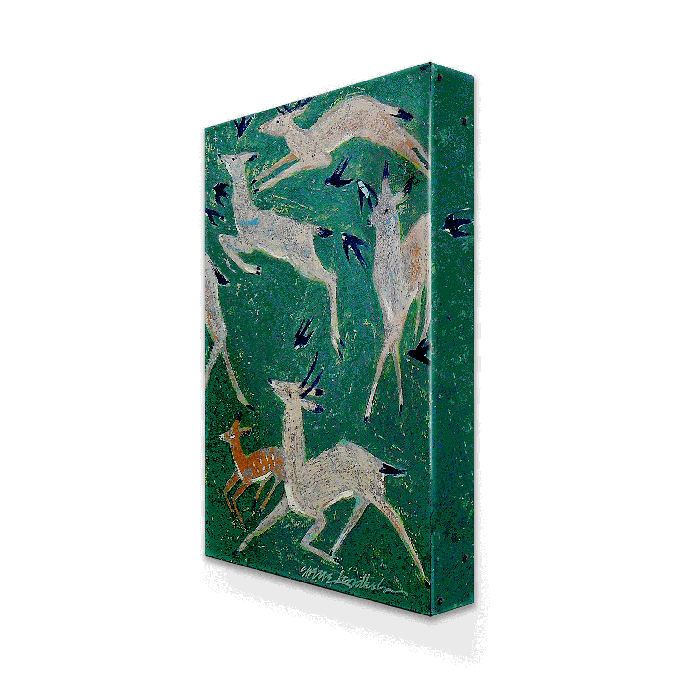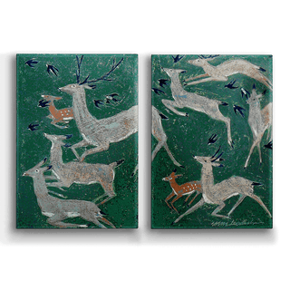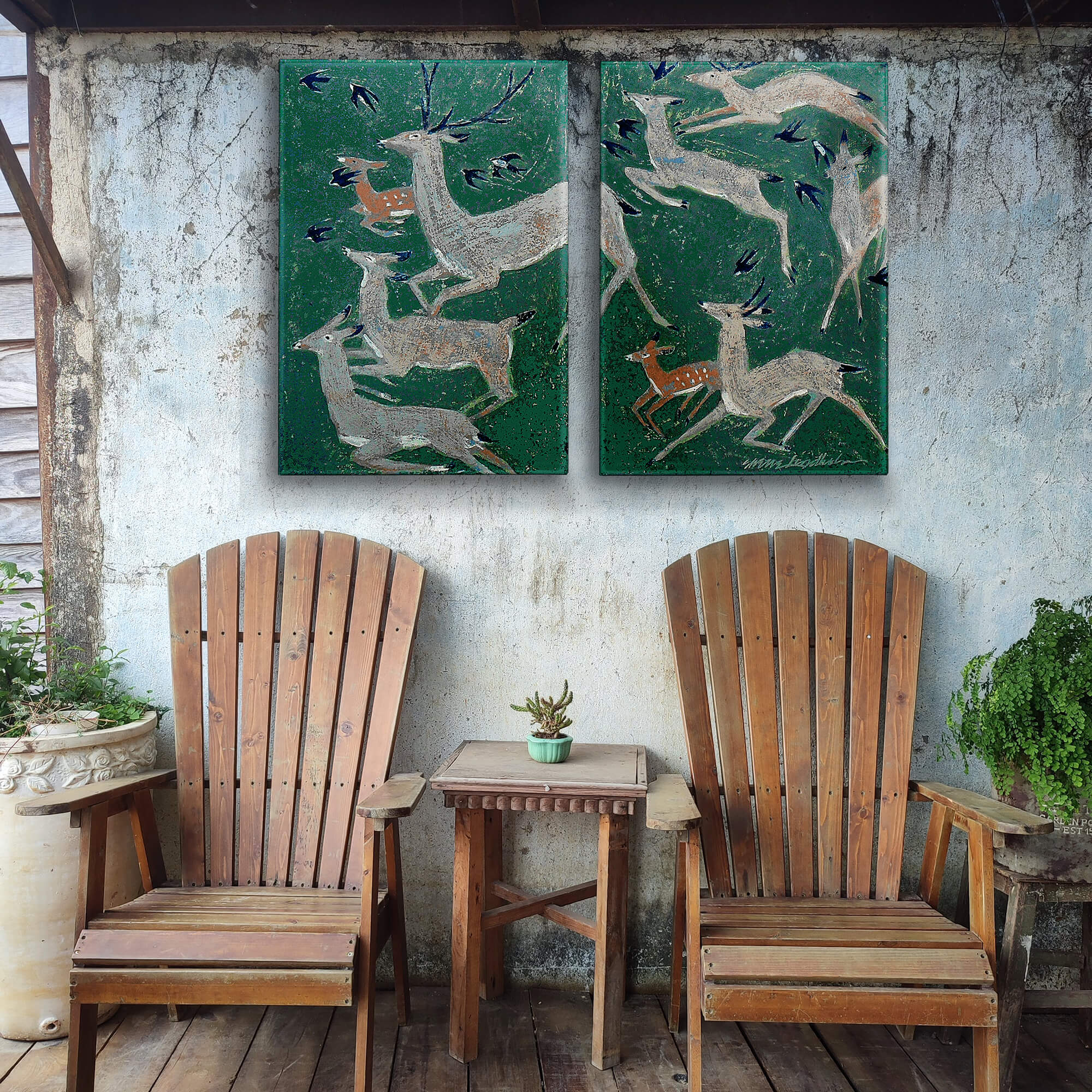 Capture the beauty of motion and nature with this enchanting diptych artwork featuring a herd of deer gracefully leaping across a lush green background. Accented by darting birds, the composition conveys energy and harmony in the natural world. Perfect for bringing a serene yet dynamic focal point to any space, this set celebrates the elegance of wildlife with a contemporary artistic flair.