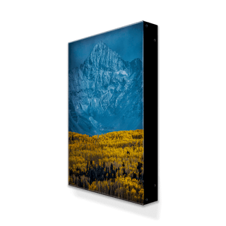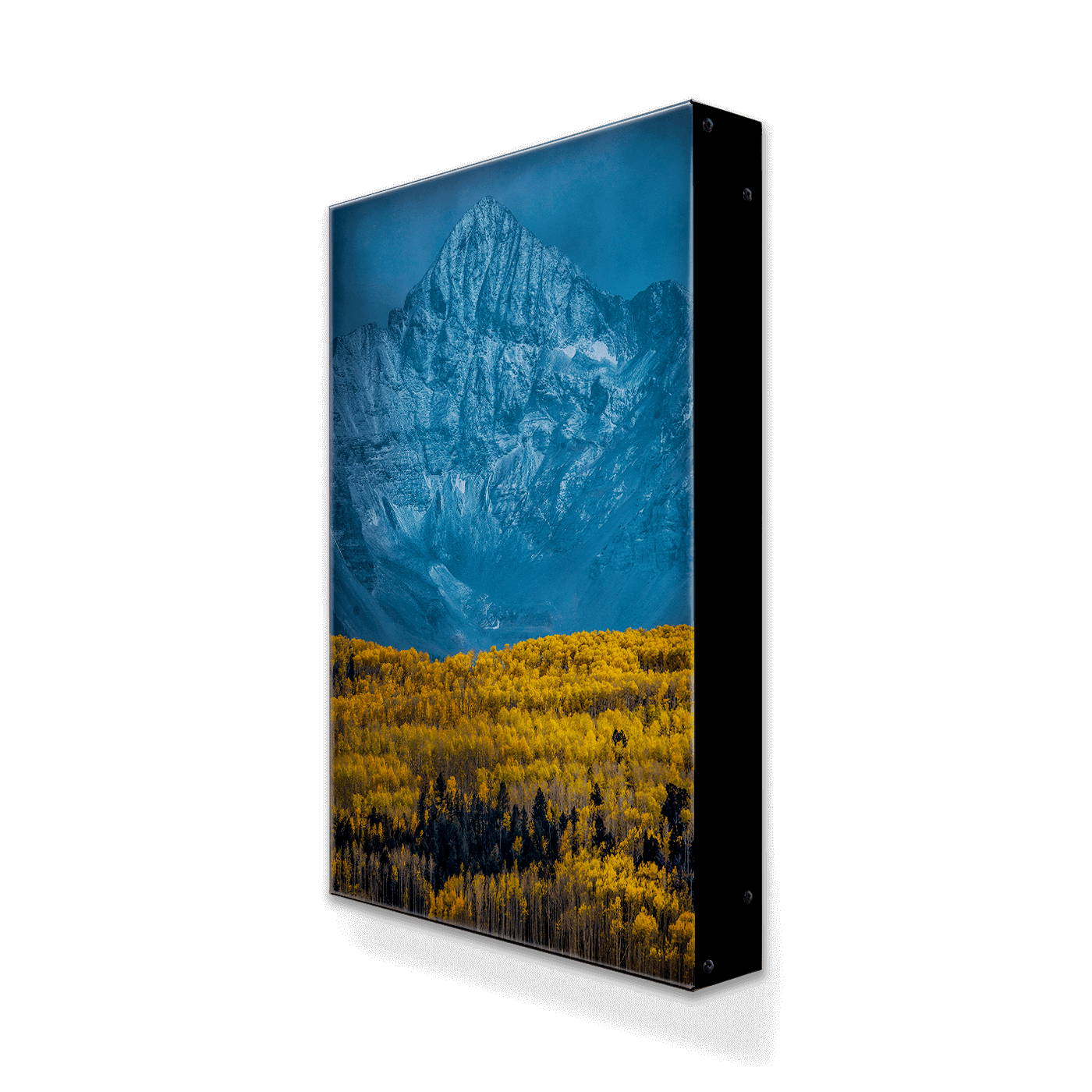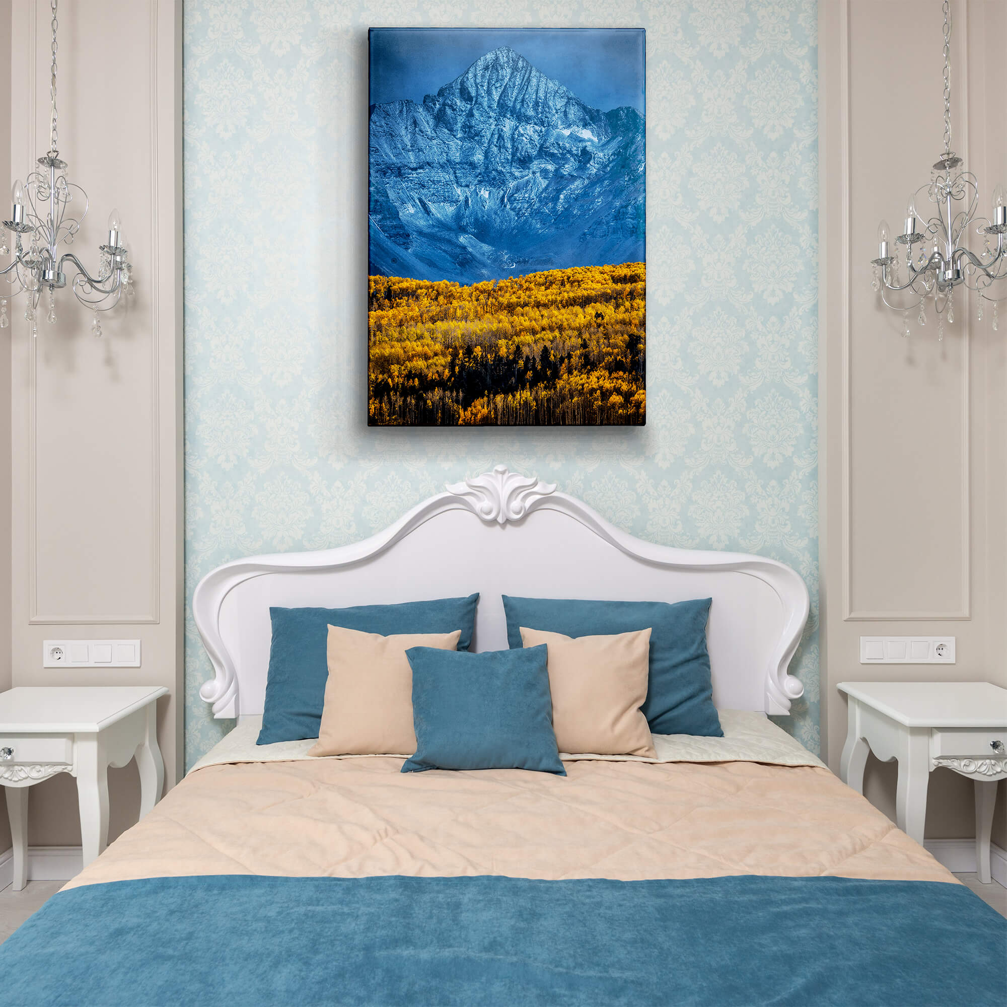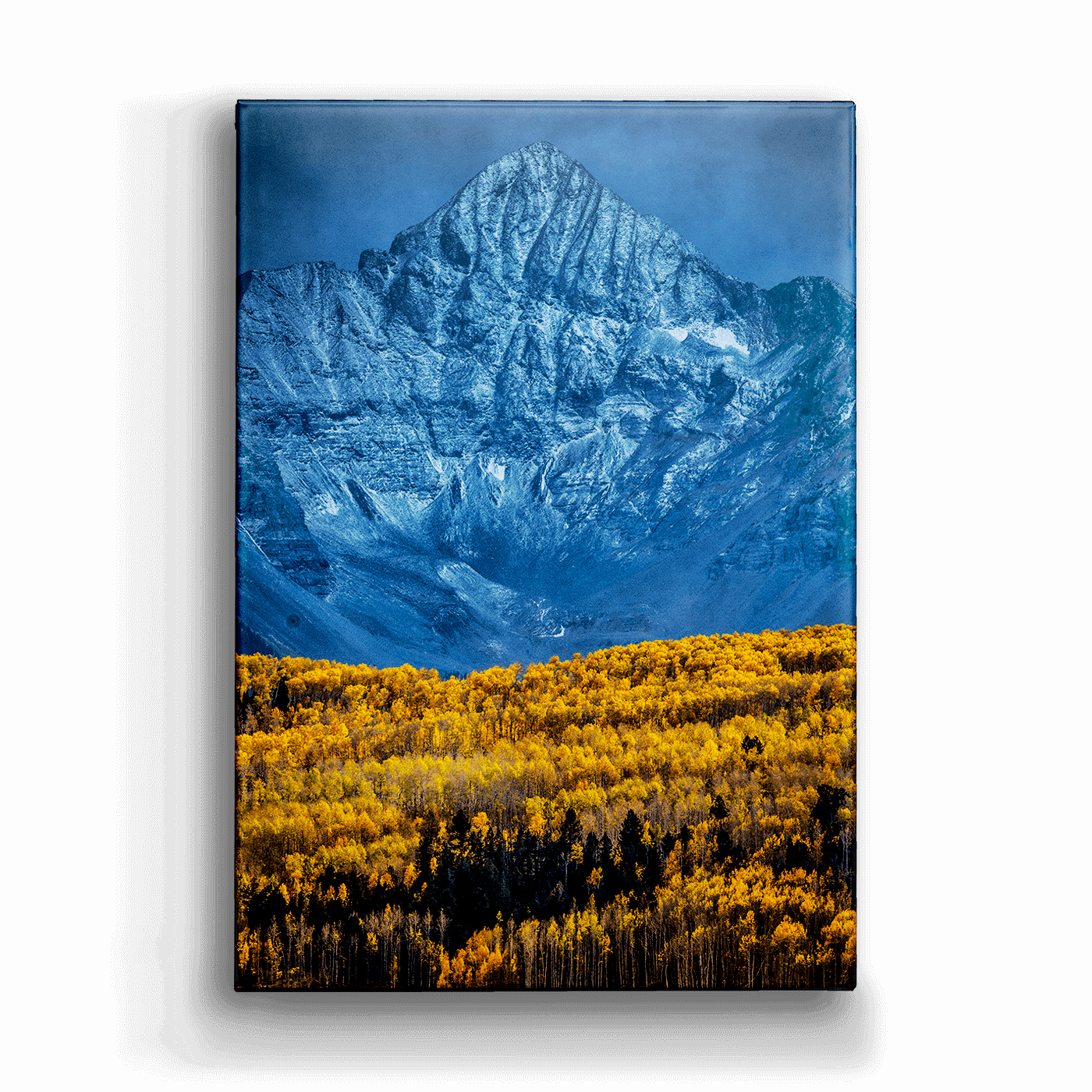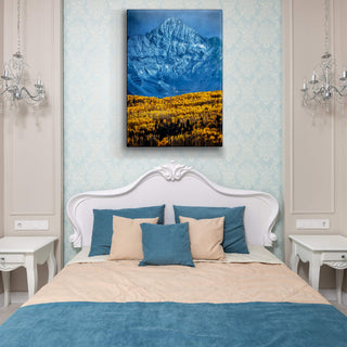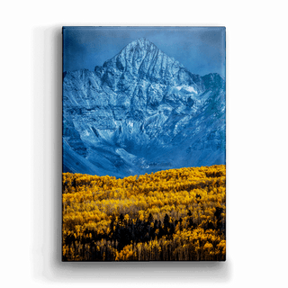 This captivating print showcases the striking contrast between the fiery hues of autumn aspens and the cool tones of a towering mountain peak. This piece beautifully marries the warmth of fall foliage with the crispness of the mountain's frosty facade, creating a dynamic and inspiring visual experience. It's a must-have for creating a stunning centerpiece in any room that calls for a touch of natural elegance.