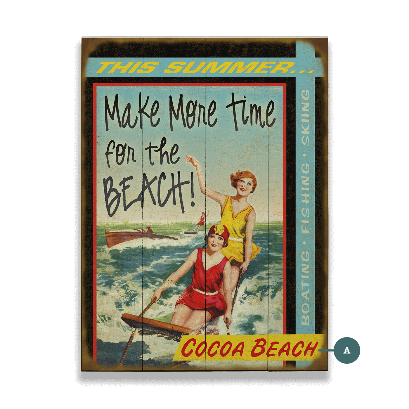 Celebrate the joys of summer with this lively vintage poster, "Make More Time for the Beach!" This vibrant piece captures the excitement of beach activities, featuring two figures enjoying water sports. The bright colors and dynamic illustration are perfect for evoking the carefree spirit of summer days spent outdoors. Ideal for those who love water adventures or collectors of nostalgic summer-themed art, this artwork adds a burst of energy and cheerful vibes to any space.