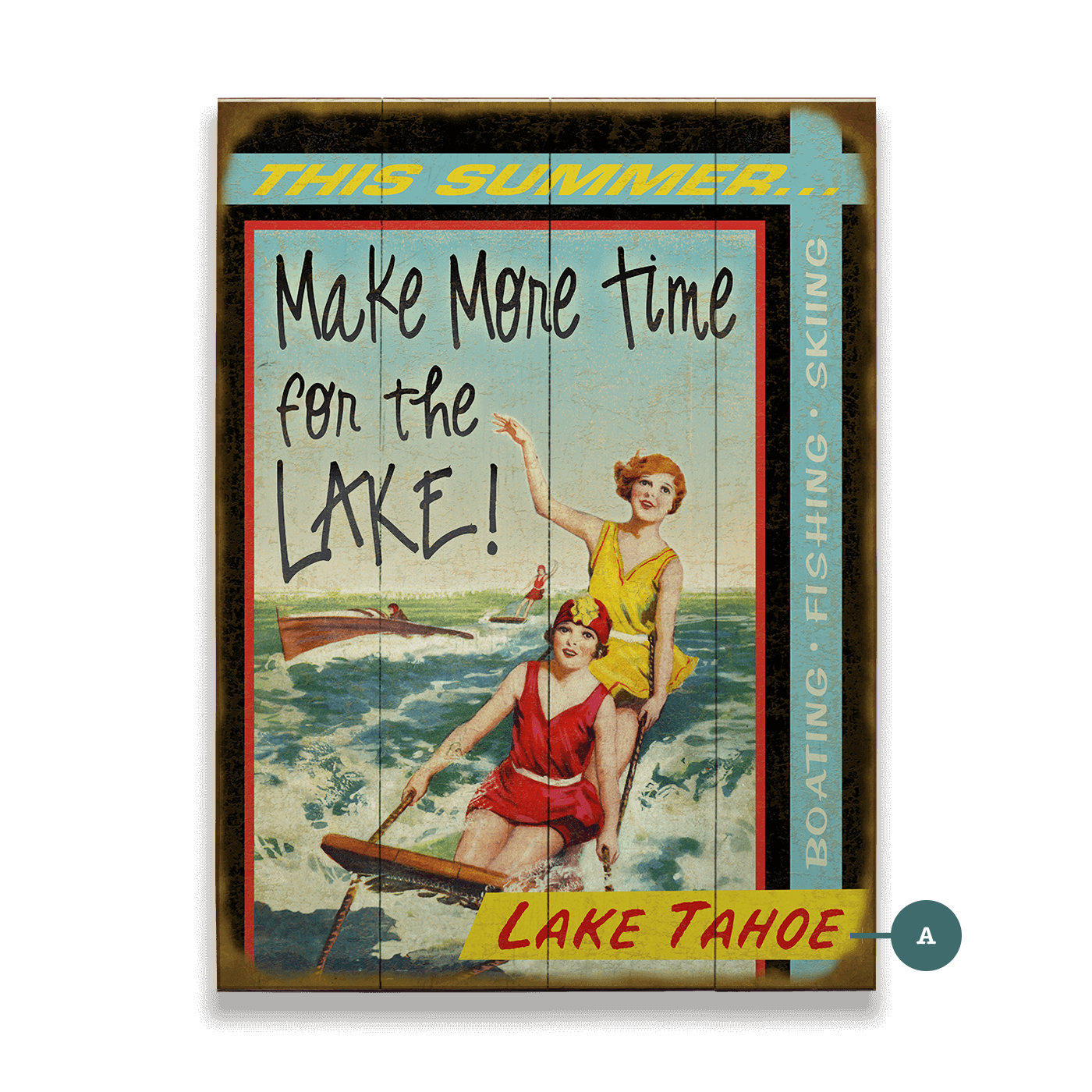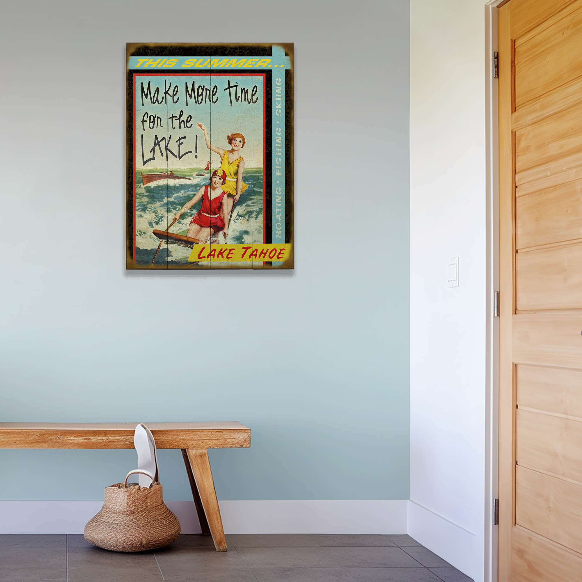 Celebrate the joys of summer with this lively vintage poster, "Make More Time for the Lake!" This vibrant piece captures the excitement of lake activities, featuring two figures enjoying water sports. The bright colors and dynamic illustration are perfect for evoking the carefree spirit of summer days spent outdoors. Ideal for those who love water adventures or collectors of nostalgic summer-themed art, this artwork adds a burst of energy and cheerful vibes to any space.