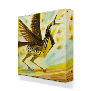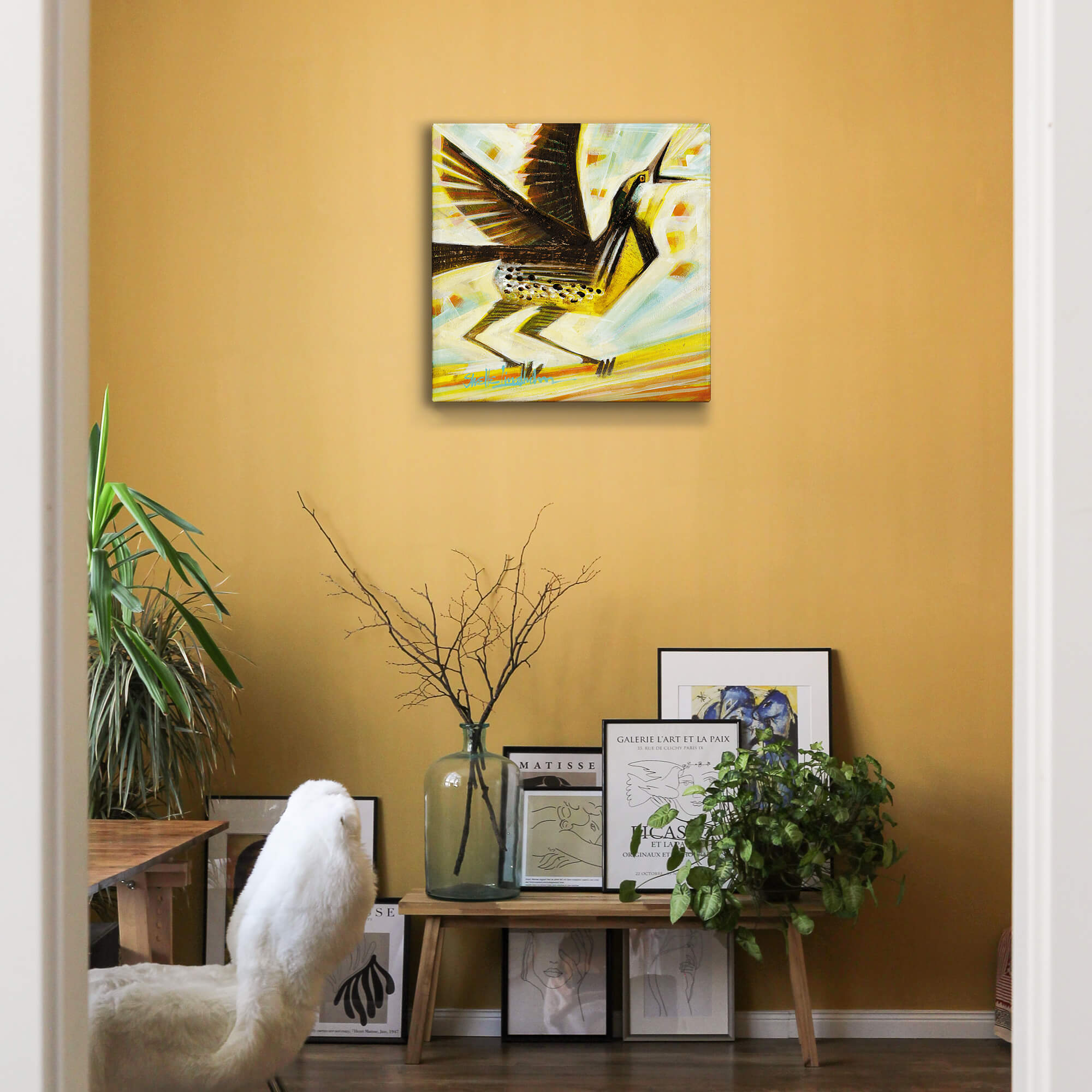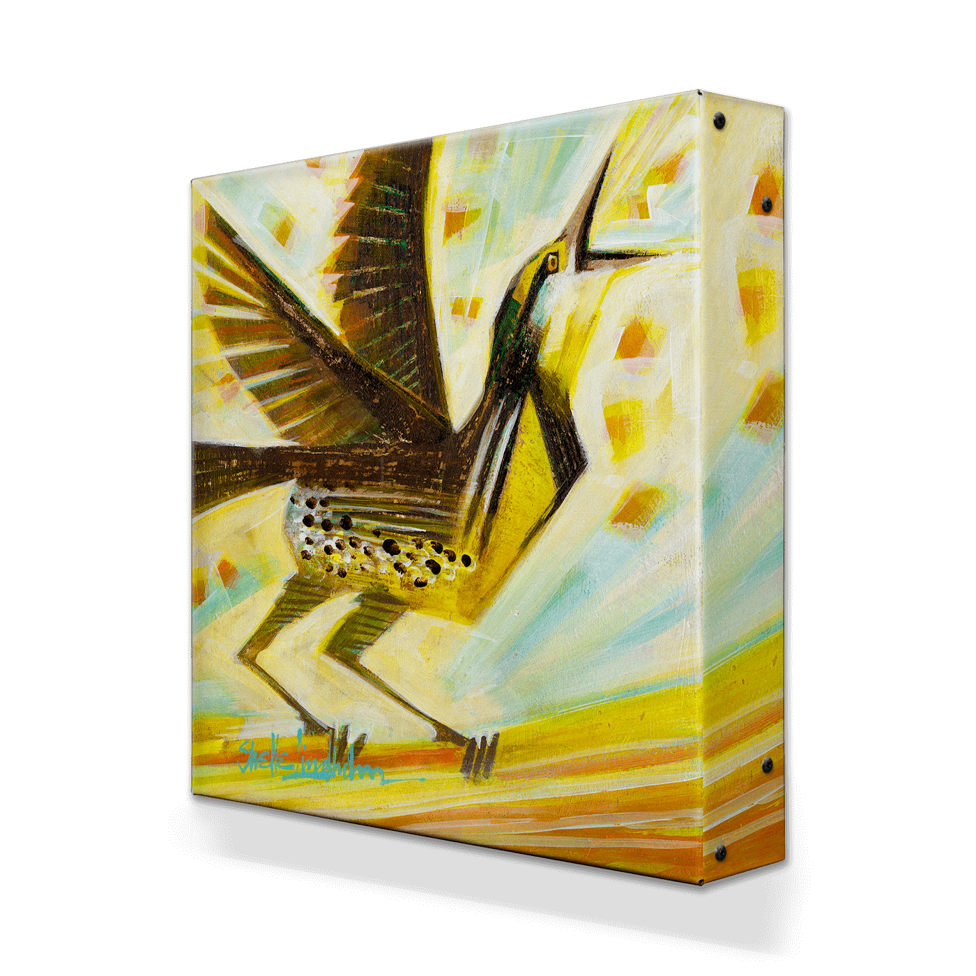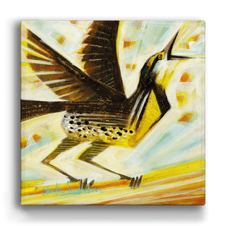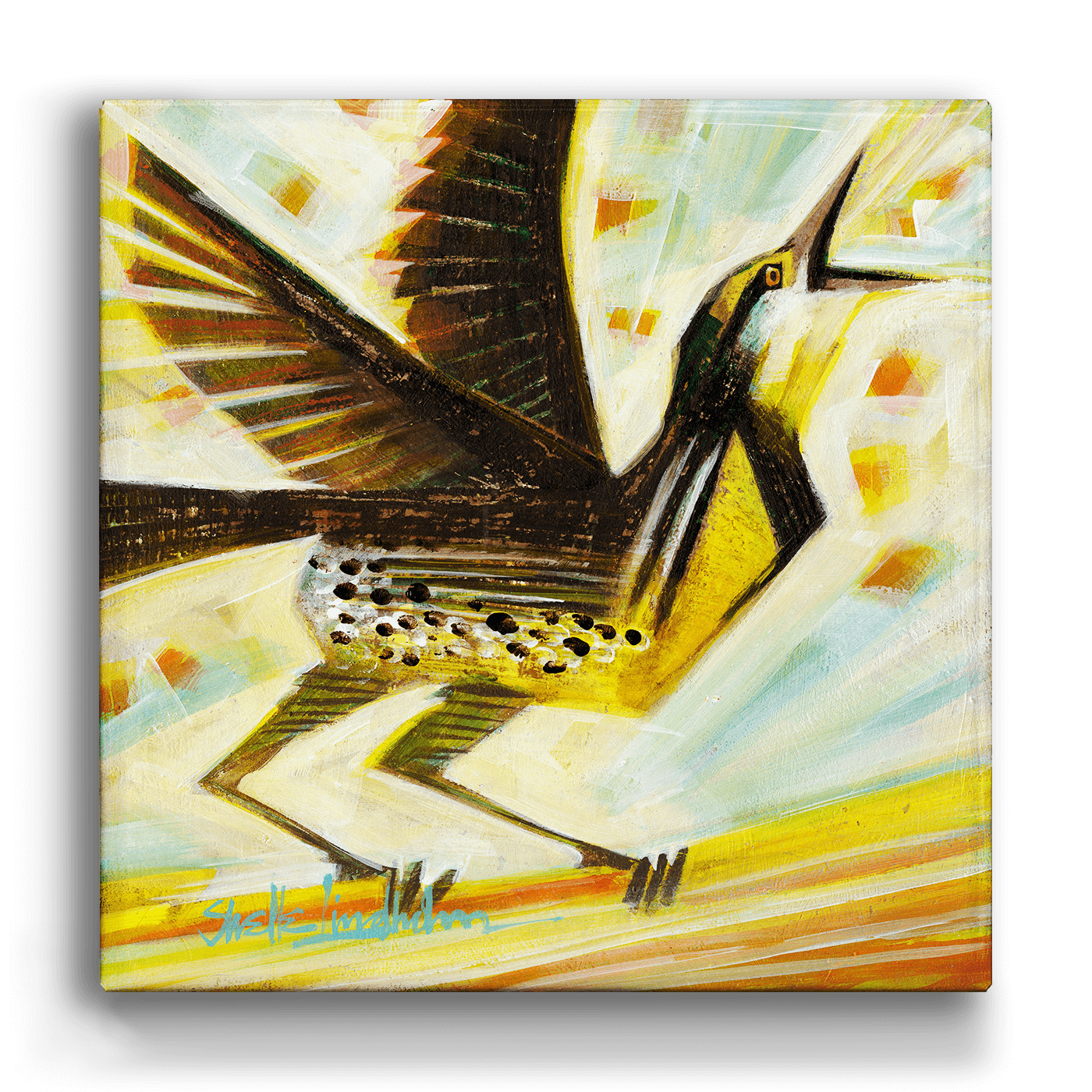 This dynamic artwork captures the vibrant energy of a meadowlark in mid-song, its golden-yellow chest and spotted markings highlighted against a radiant, sunlit background. The bold brushstrokes and luminous tones create a sense of movement and joy, evoking the warmth of open fields and the beauty of nature's melody. Perfect for adding a touch of brightness and vitality, this piece celebrates the uplifting spirit of the meadowlark.