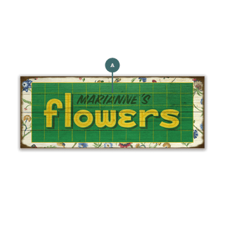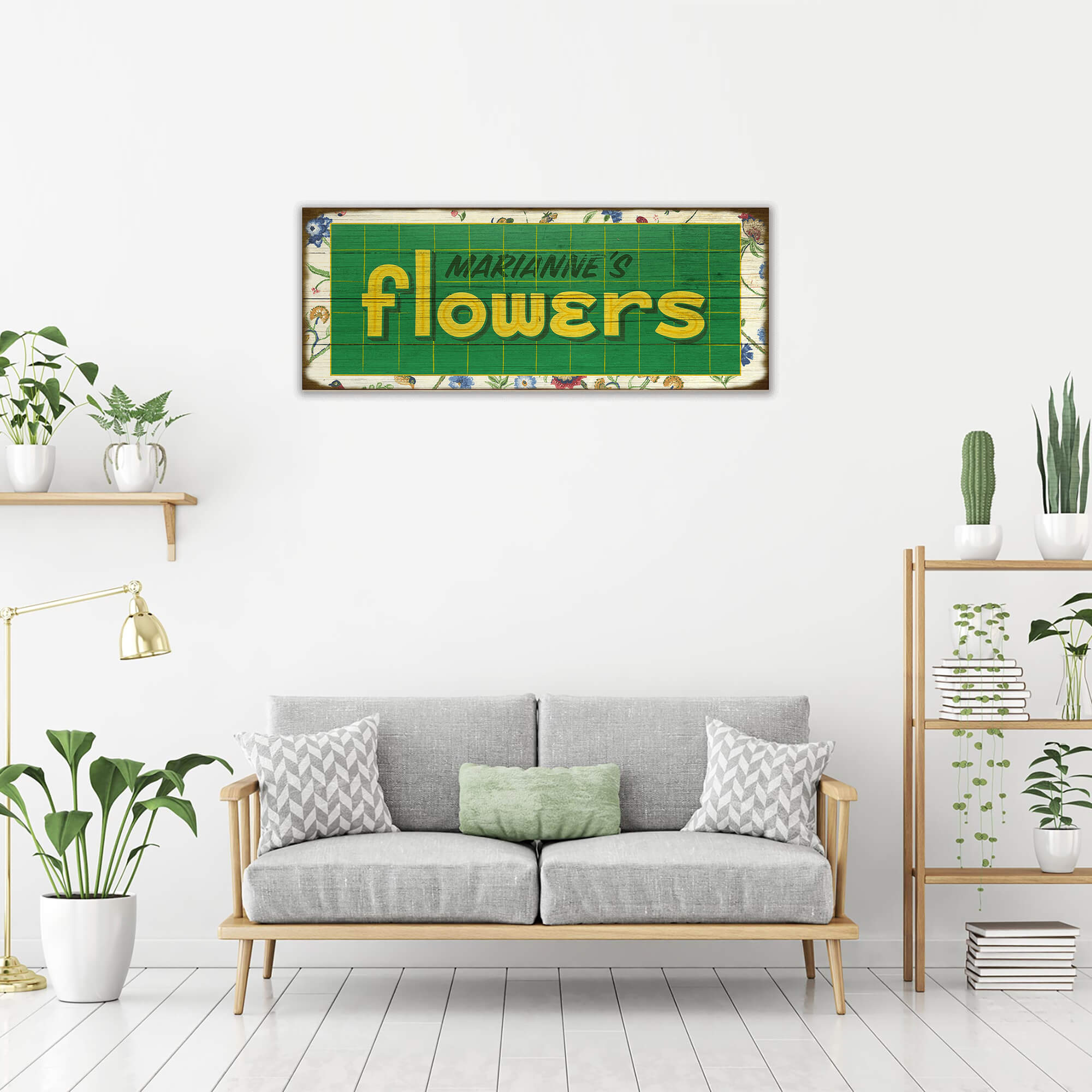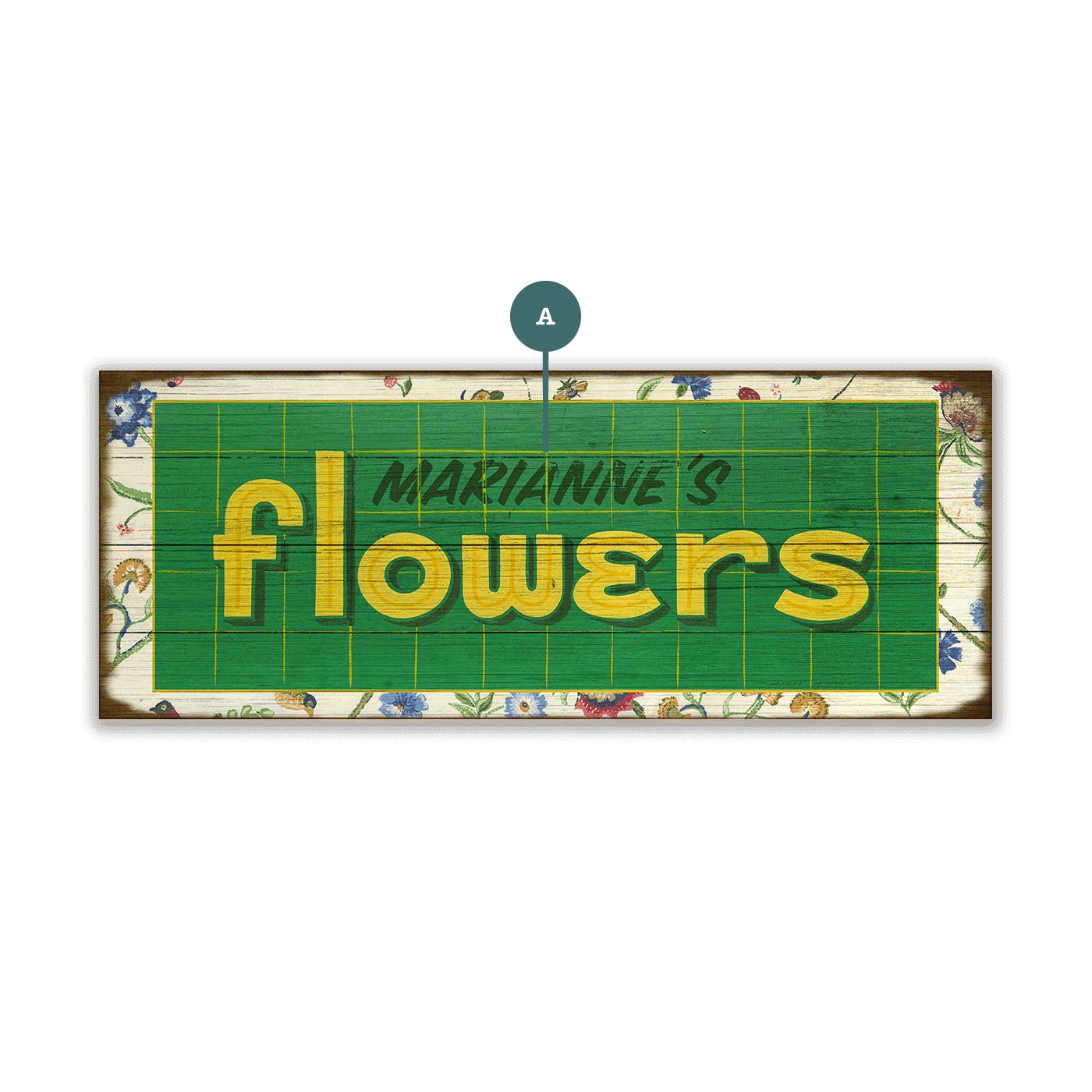 Immerse yourself in the beauty of blooms with "Marianne's Flowers," a captivating vintage-style sign that brings the essence of a quaint, charming flower shop right into your living space. Set against a backdrop of vibrant green with a delicate floral border, this piece exudes the allure of a gardener's paradise. Personalize your piece with custom text to reflect your individual style or to gift a special touch to the green thumbs in your life.
