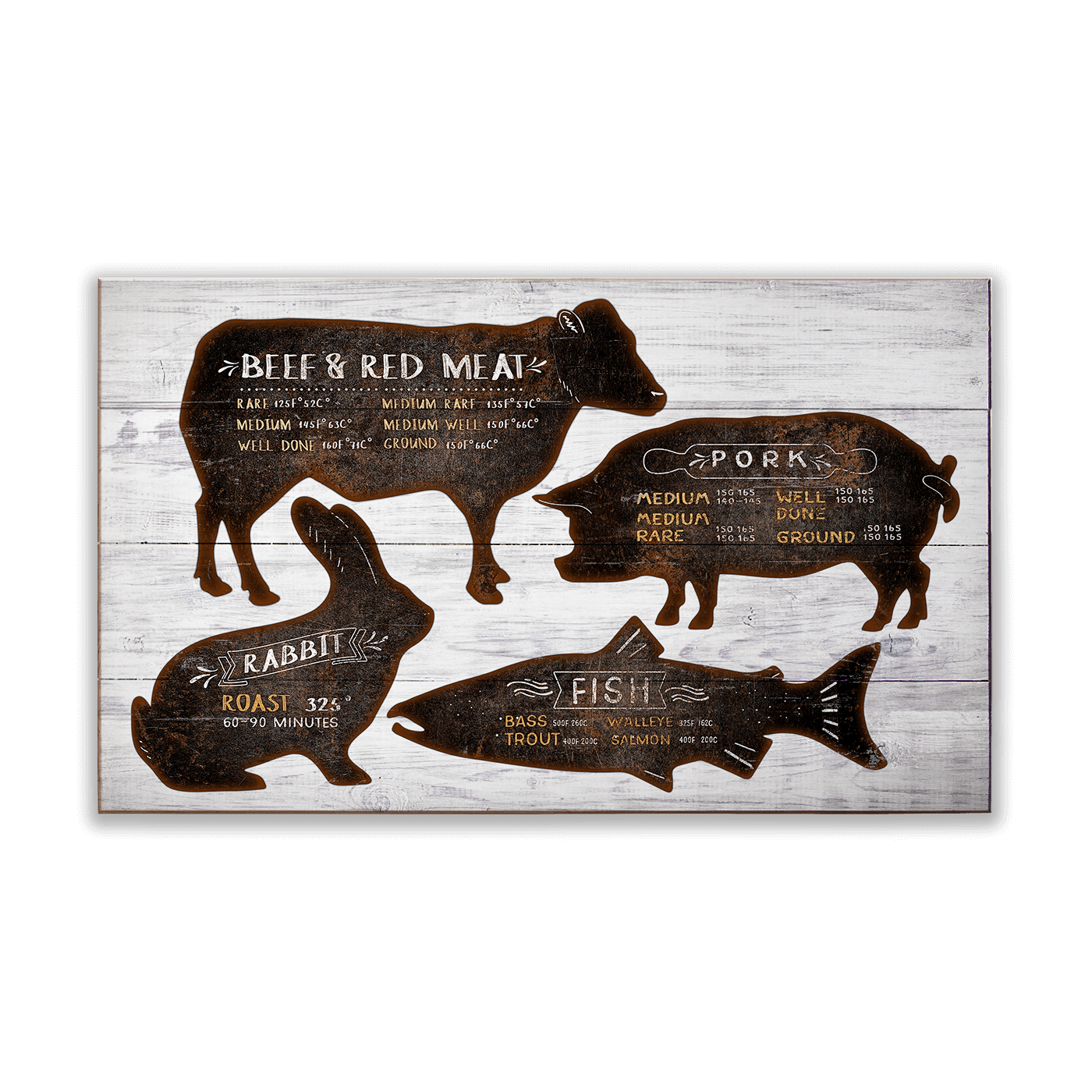 Blending rustic charm with culinary functionality, this piece features beautifully crafted silhouettes of beef, pork, rabbit, and fish, each adorned with cooking temperatures for perfect preparation. The metallic distressing against the textured background create a vintage butcher shop aesthetic, while the elegant hand-lettering adds a touch of farmhouse appeal. Both decorative and practical, this artwork serves as a stylish kitchen reference for home chefs, grill masters, and anyone who appreciates the art of cooking quality meats. Perfect for farmhouses, butcher shops, and rustic-inspired kitchens.