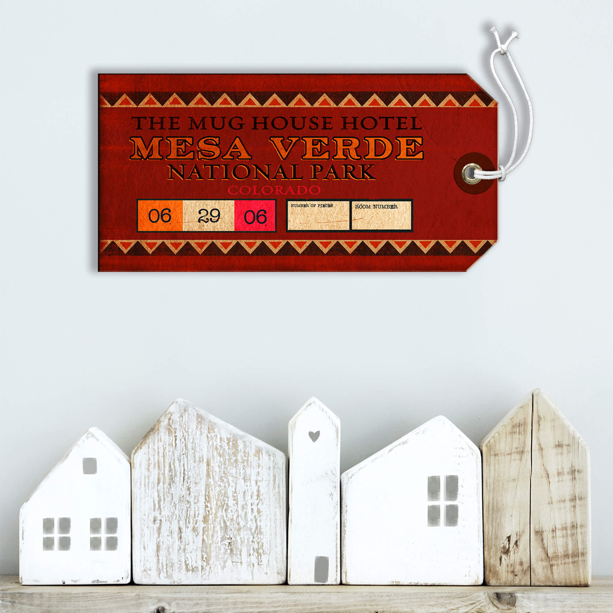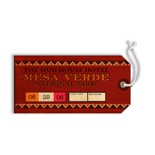 This unique artwork features a vintage-style luggage tag design that pays homage to the rich history of Mesa Verde National Park. Highlighting the fictional "Mug House Hotel," this piece draws inspiration from the actual Mug House, a massive multi-room archaeological site within the park. The design captures the essence of exploration and cultural heritage, making it a perfect addition to any travel enthusiast’s collection. With its warm, earthy tones and bold typography, this artwork evokes the timeless beauty of Mesa Verde and the spirit of adventure.