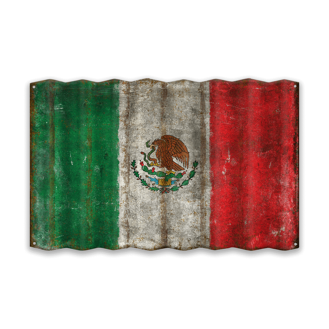 This striking artwork showcases the Mexican flag depicted on a rustic, corrugated metal sign, adding an antique and cultural flair to its presentation. The flag's vibrant green, white, and red bands are complemented by the central emblem featuring an eagle perched on a cactus, clutching a serpent. This symbol is a powerful representation of Mexican heritage and history. The textured, distressed finish enhances the artwork's visual impact, making it a perfect decorative piece for those looking to infuse their space with a sense of Mexican pride and historical resonance.