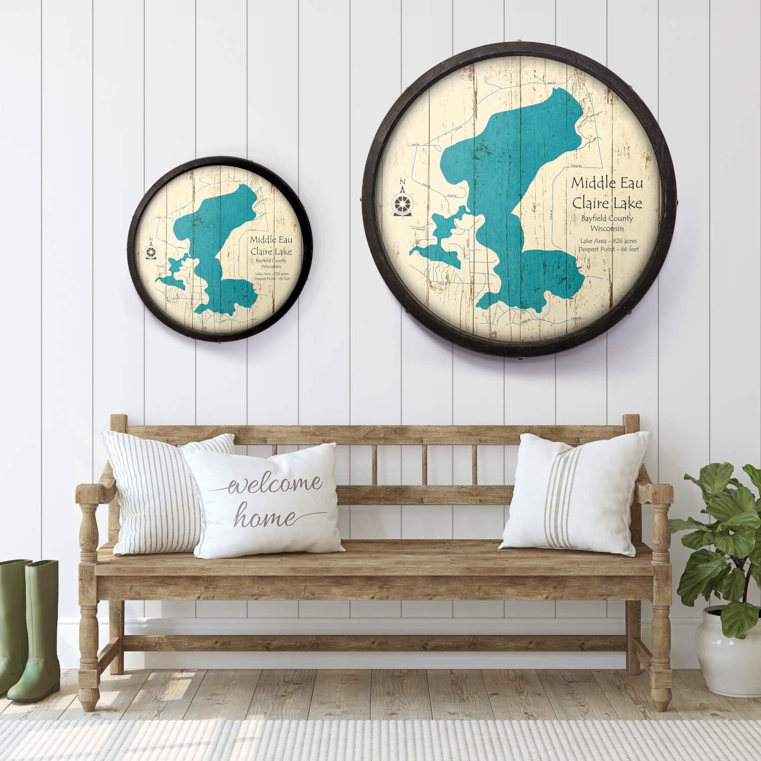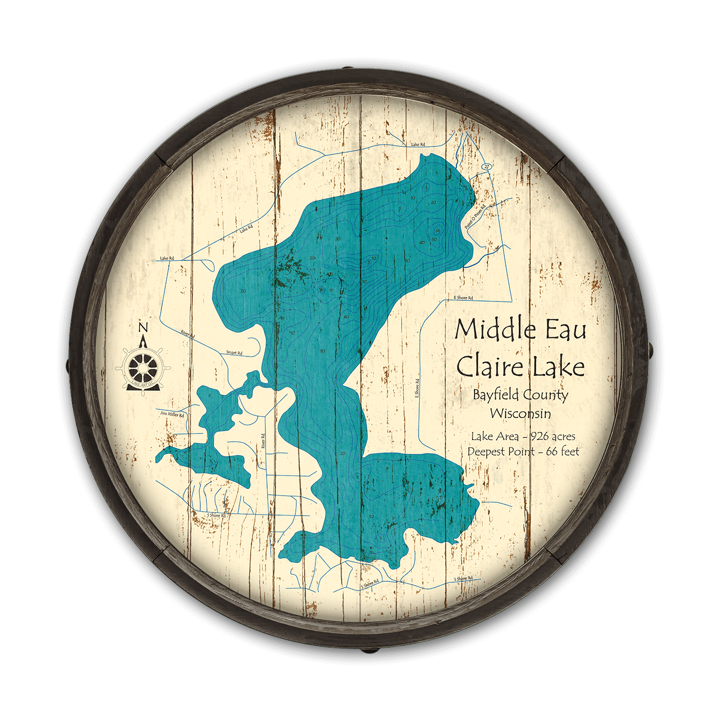 Immerse yourself in the tranquil beauty of Wisconsin's natural landscapes with this stunning piece of art that maps the contours of Middle Eau Claire Lake in Bayfield County. Explore the intricate details of one of Wisconsin's beloved freshwater treasures. With a lake area of 926 acres and depths reaching 66 feet, Middle Eau Claire Lake is a hub for water sports enthusiasts. The map's topographic layers, rendered in soothing blue hues against a warm wooden background, offer a sense of the lake's depth and the surrounding landscape, providing a perfect blend of art and information. Whether you're a local resident, a frequent visitor, or a lover of lake geography, this artwork is bound to capture your heart with its elegant design and the promise of Wisconsin's serene, water-filled landscapes.