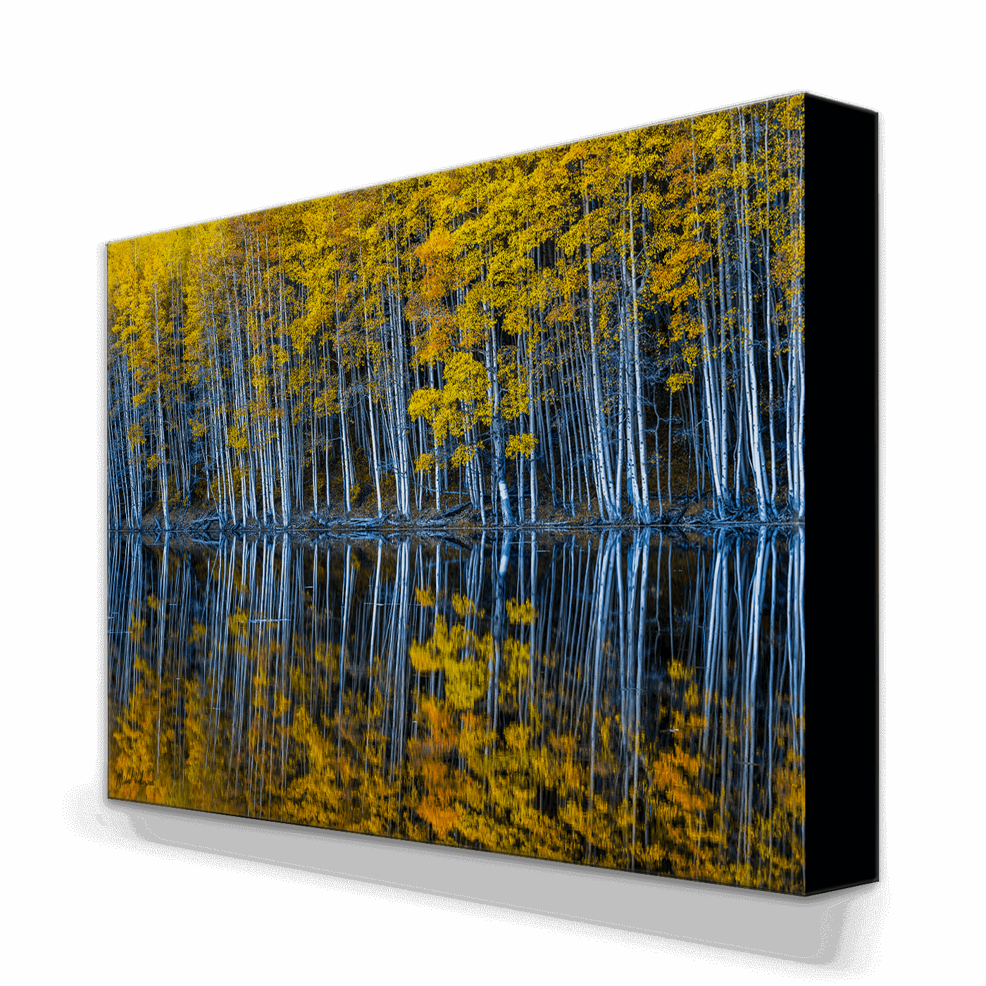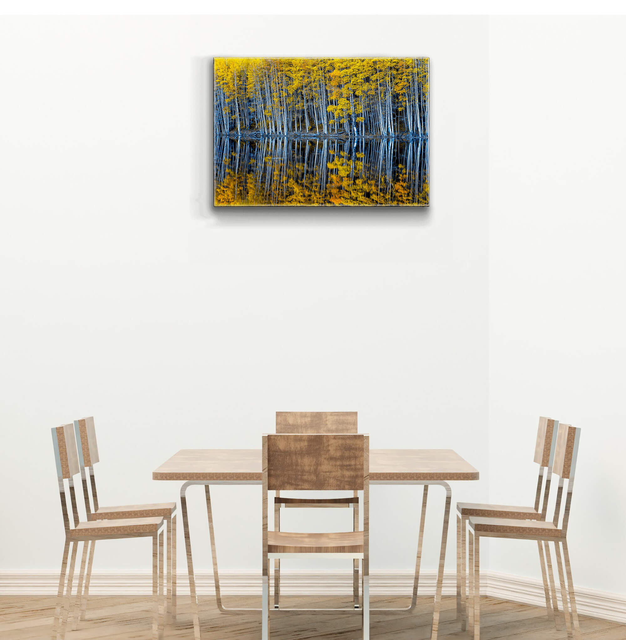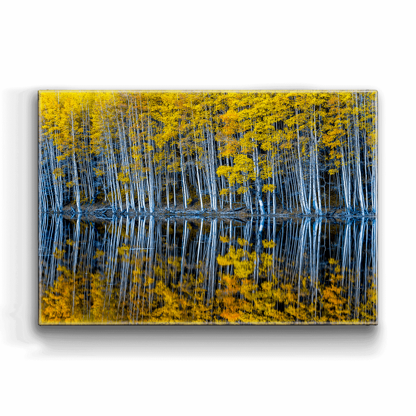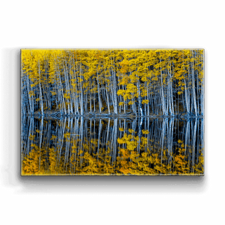 A serene autumnal scene unfolds as aspens with golden foliage stand tall against a contrasting dark backdrop. The calm waters at their feet capture a mirror-like reflection, doubling the visual spectacle and creating an almost surreal landscape. This tranquil moment in the wilds invites onlookers to lose themselves in the beauty of the season.