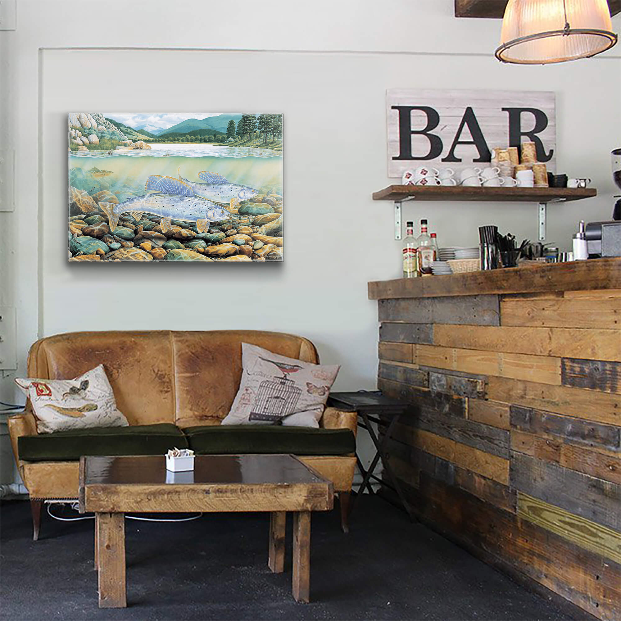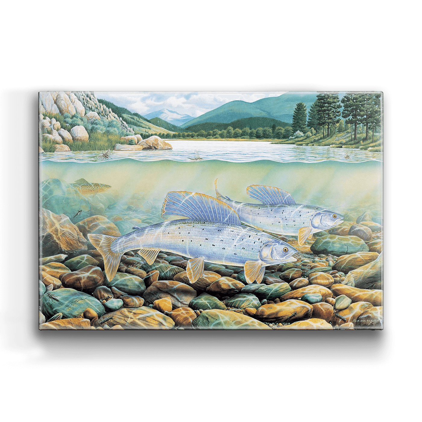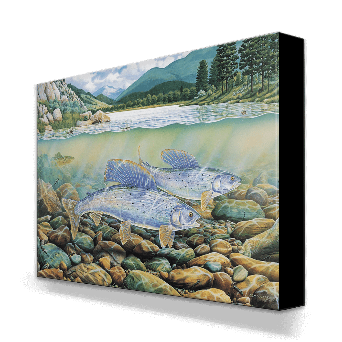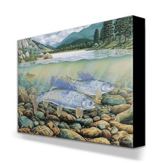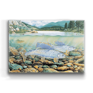 Dive into the captivating beauty of nature with this stunning artwork featuring grayling fish gliding gracefully over a bed of vibrant, multicolored river stones. The split-view composition reveals both the serene aquatic world beneath the surface and a picturesque mountainous landscape above, complete with lush green forests and tranquil waters. This piece masterfully captures the harmony of life in an unspoiled stream, making it a perfect addition to any nature lover’s collection. Ideal for anglers, outdoor enthusiasts, or anyone seeking a connection to the wild, this artwork invites you to immerse yourself in the wonders of aquatic ecosystems.