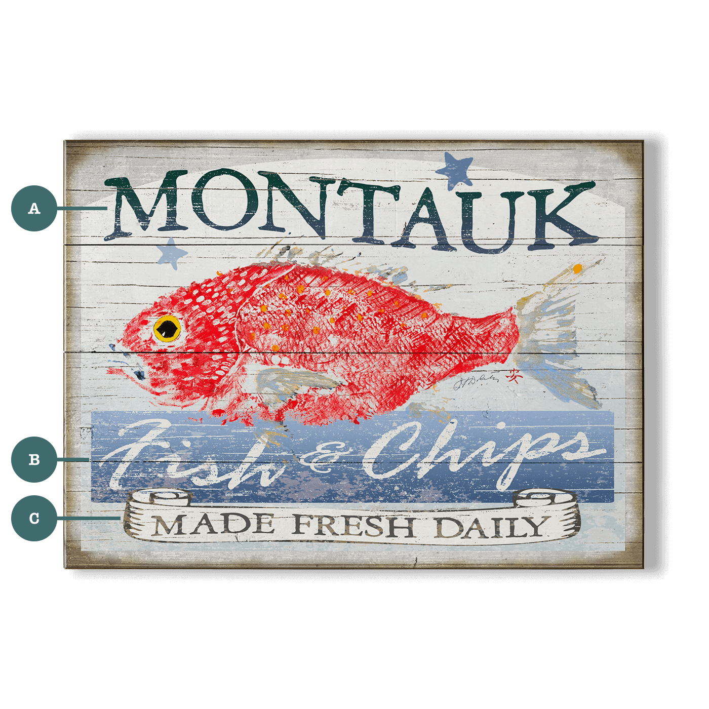 Indulge in the coastal charm of the East End with "Montauk Fish & Chips" — a striking artwork capturing the essence of the beloved seaside dining experience. Rendered with the historic Gyotaku technique, this vibrant Red Snapper leaps off the canvas, symbolizing the freshness of Montauk's local catch. Set against a rustic background, emblazoned with the promise of made fresh daily, it's a delightful nod to the town's rich fishing culture, perfect for any seafood lover's kitchen or dining area.