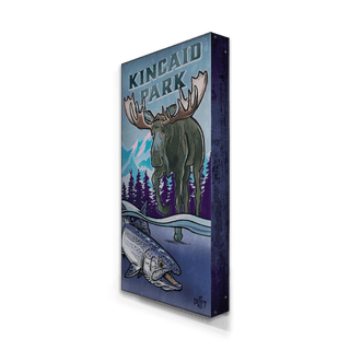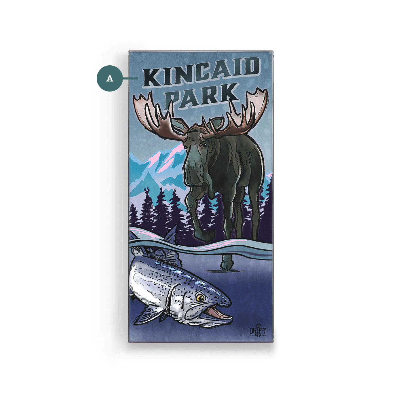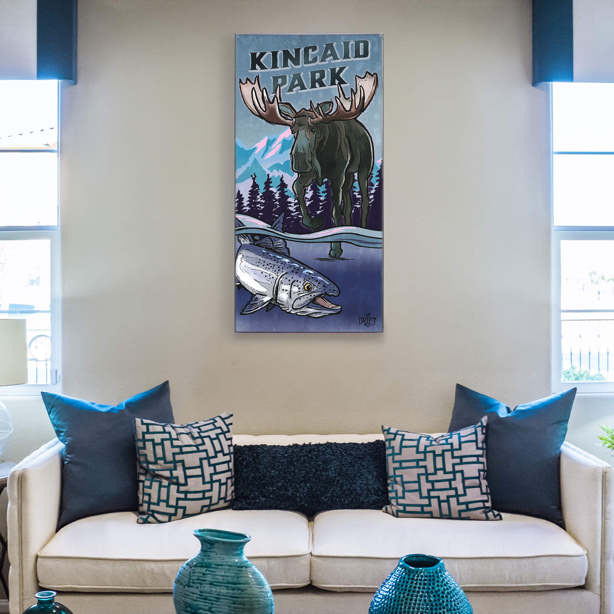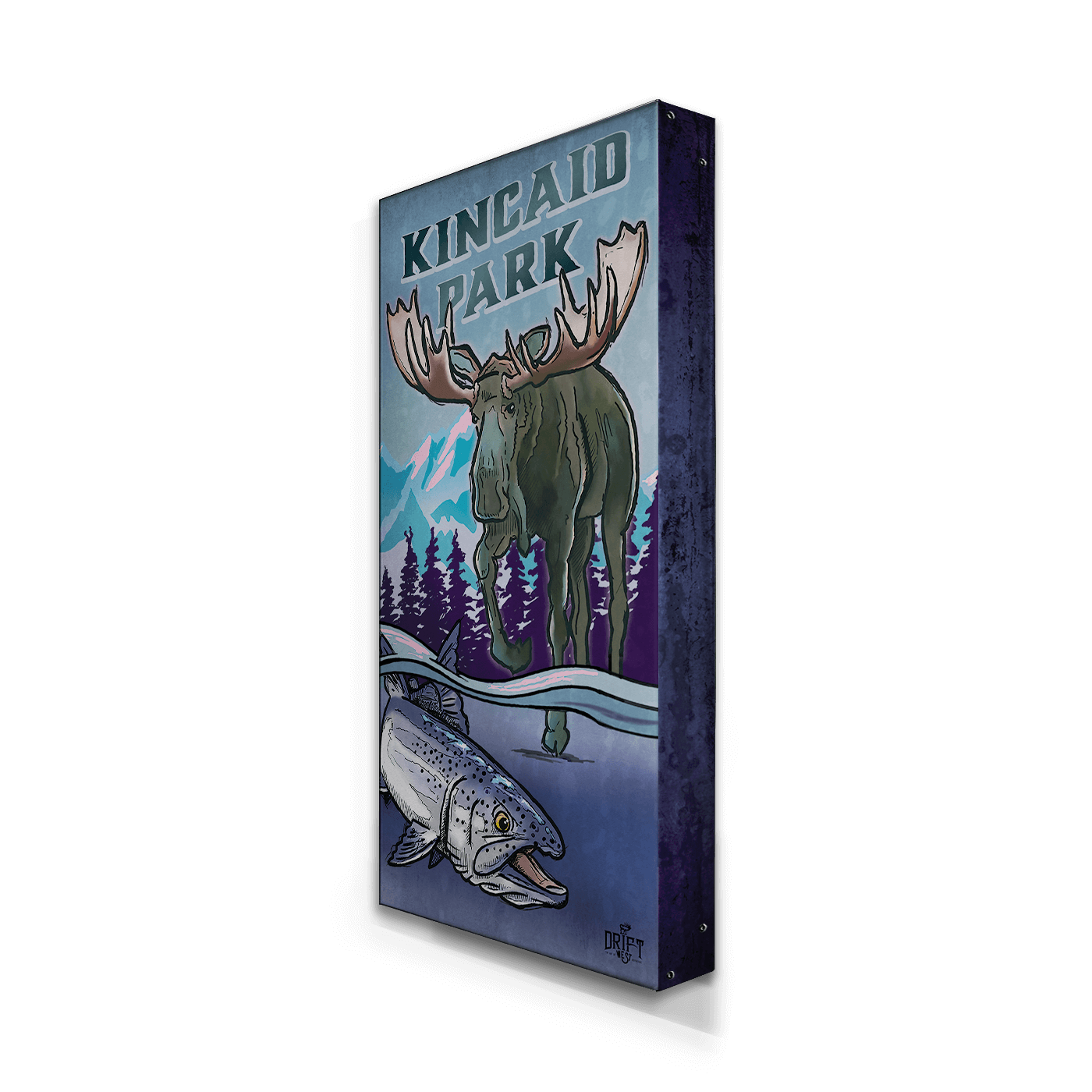 In this piece, Ed Anderson contrasts the rugged silhouette of a moose against a backdrop of snow-capped mountains, while a salmon glides through the icy river below. The deep blue tones evoke the crisp chill of winter, perfectly capturing the season’s quiet intensity. This limited edition artwork aligns with the natural themes of Anderson’s series, particularly when showcased with "Elk and Trout at Dawn.