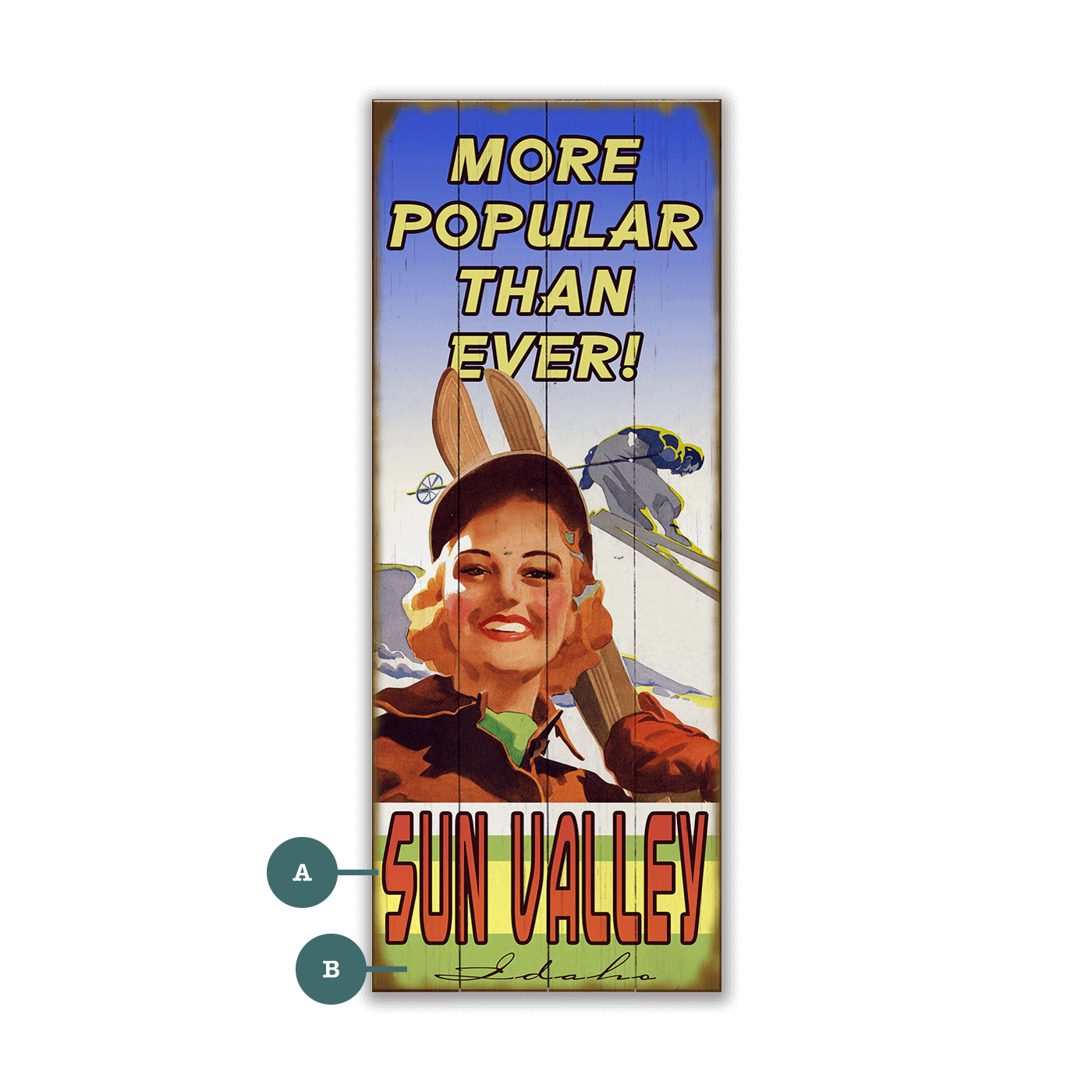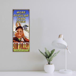 This artwork celebrates the classic allure of skiing, featuring a cheerful skier radiating warmth and excitement with skis slung confidently over her shoulder. The vibrant colors and dynamic design reflect the joy of winter sports, while the background showcases an airborne skier soaring over a snowy landscape. Bold typography emphasizes the popularity and enduring appeal of the destination, creating a sense of energy and fun. Perfect for lovers of skiing and mountain adventures, this piece captures the spirit of outdoor recreation and the joy of hitting the slopes.