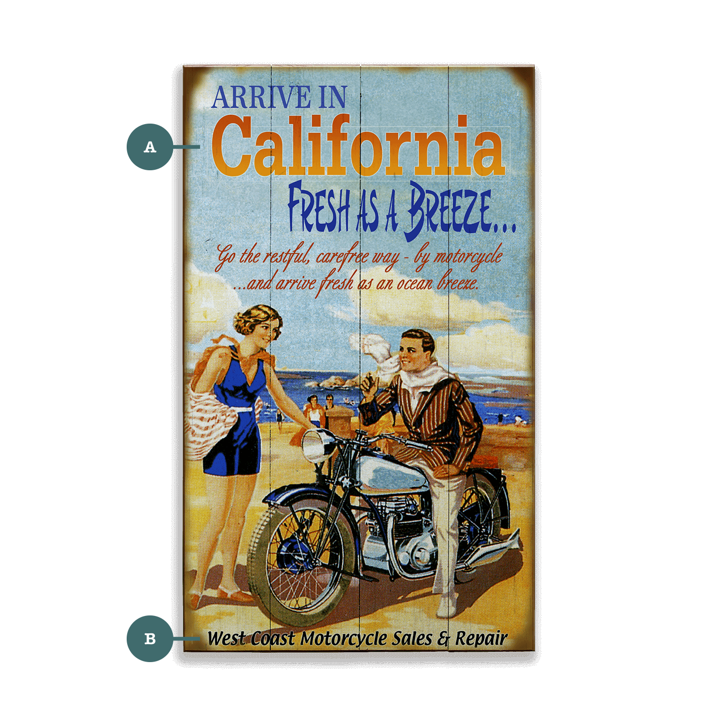 Loyd, who had been dabbling in cartooning and surfing, was encouraged to take an art class taught by Eric Titlebaum, a cartoonist of Playboy Magazine notoriety. With time to tinker during the desolate winters, Laura began asking Loyd to create merchandise for their shop. Recognizing the untapped potential of the skiing crowd, they started designing and producing unique wood and metal signs inspired by vintage ephemera.
