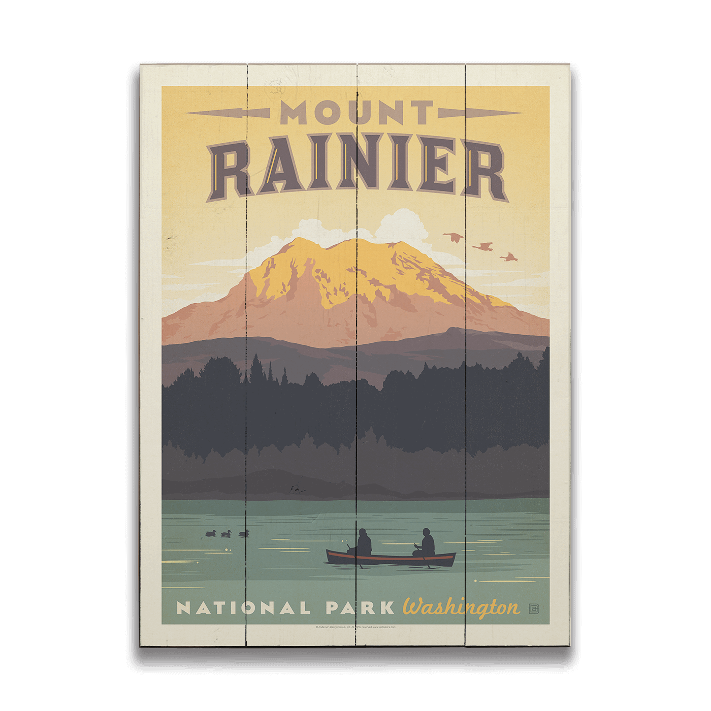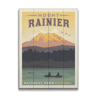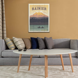 Discover the timeless allure of Mount Rainier National Park through this enchanting vintage-style artwork. Perfect for outdoor enthusiasts and art collectors alike, the artwork captures the majestic Mount Rainier with its snow-capped peak soaring above the serene forest landscape. In the foreground, a tranquil lake scene unfolds with a pair of adventurers rowing, adding a touch of peaceful human presence to the vast wilderness.