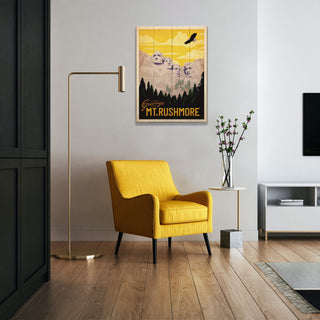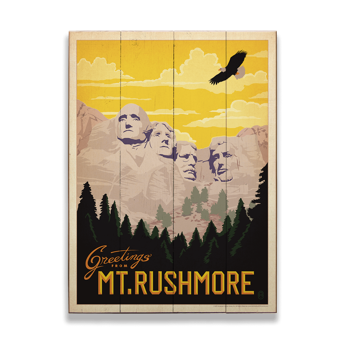 Step into the monumental grandeur of the Black Hills with this vintage-style artwork of Mount Rushmore National Memorial. Greeting you with the majestic portraits of four U.S. presidents, this print captures the essence of American heritage against the backdrop of South Dakota's stunning landscapes. The soaring eagle adds a touch of freedom and the spirit of the wild, while the lush green pines frame this man-made marvel.
