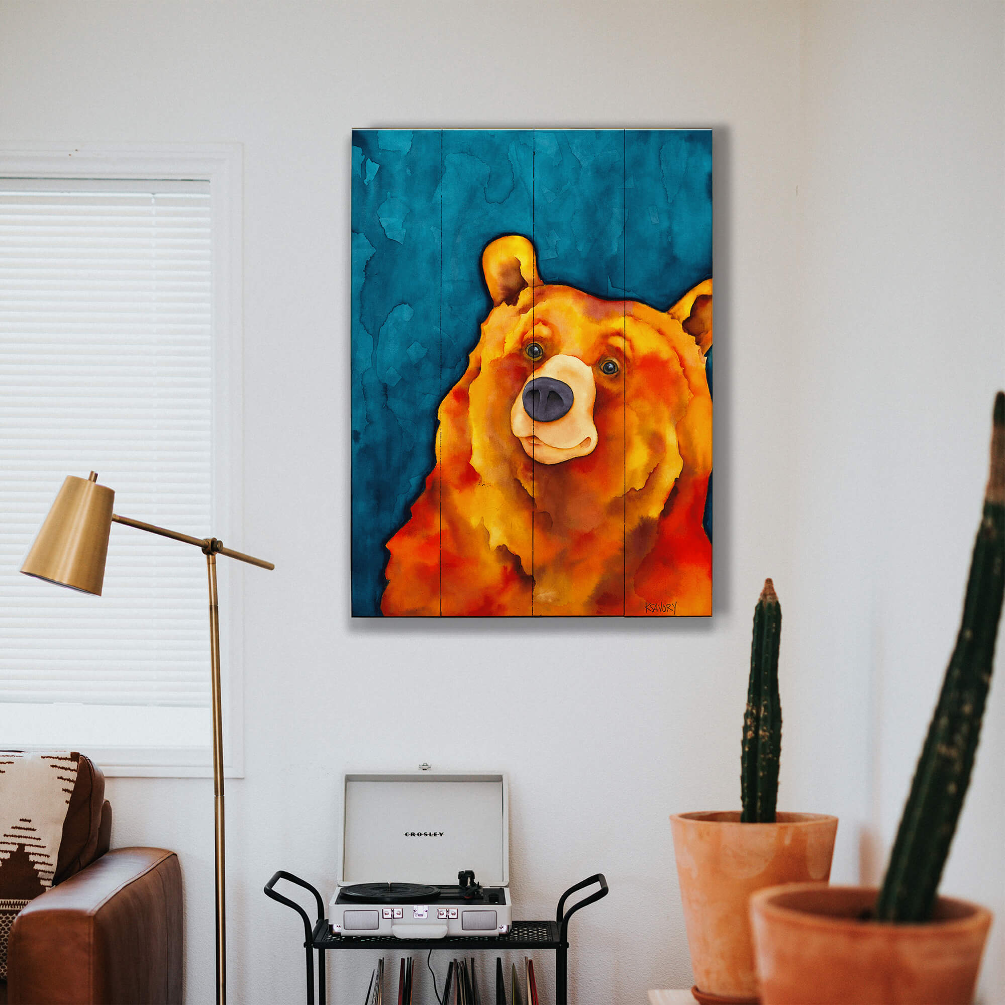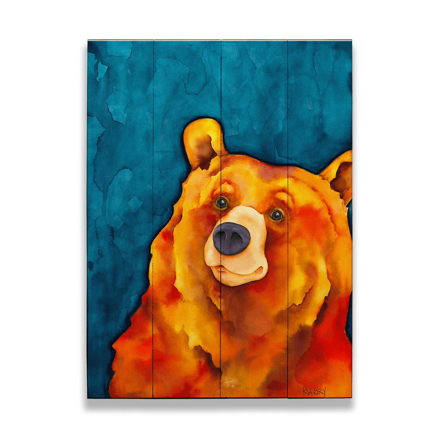 Explore the expressive charm of this vibrant watercolor painting, featuring a bright and cheerful bear against a cool blue background. The warm, fiery tones of orange and yellow in the bear's fur are a delightful contrast to the soothing blues, creating an impactful visual presence. Perfect for animal lovers and art enthusiasts, this piece brings a lively splash of color and a sense of joy to any room.