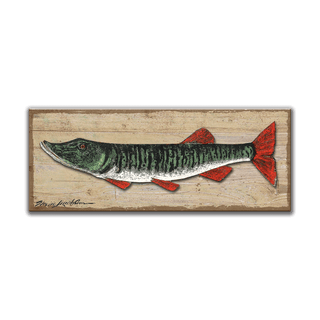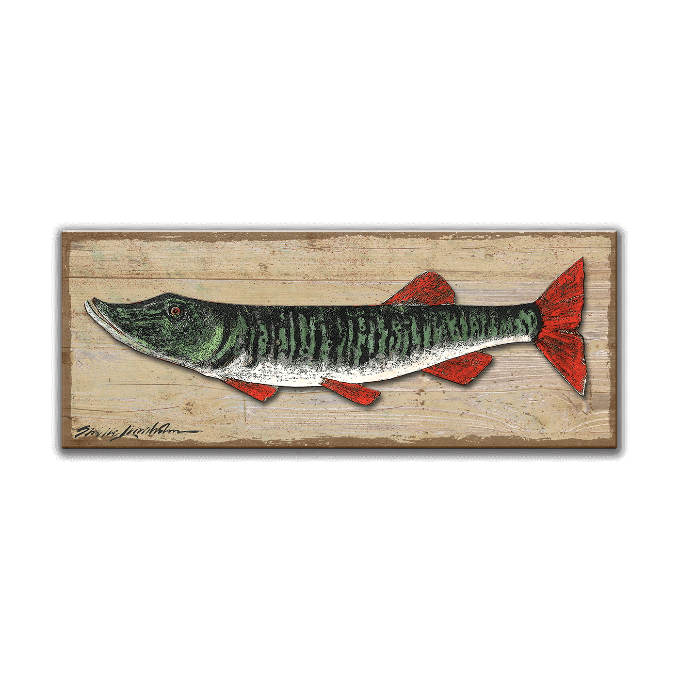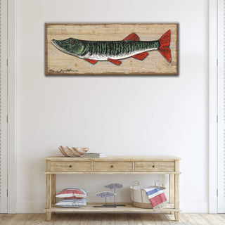 Discover the unique charm of this rustic muskie fish artwork, masterfully printed on aluminum and set against a distressed light tan, slatted wood background. This piece elegantly combines texture and color, featuring vibrant red accents that bring the fish to life.