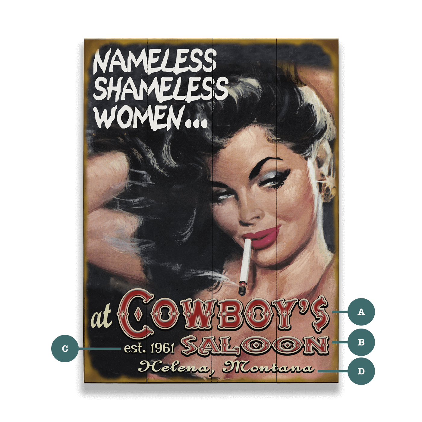 With bold, painterly strokes and a sultry vintage aesthetic, this piece captures the essence of mid-century bar culture and classic pin-up allure. The striking illustration, featuring a confident, smirking woman with tousled hair and a cigarette dangling from her lips, evokes the rebellious charm of old-school saloons. The distressed edges and retro typography add to the well-worn authenticity, making it feel like a relic from a bygone era. Perfect for bars, lounges, or any space that embraces the nostalgia of classic Americana and the untamed spirit of the Wild West.