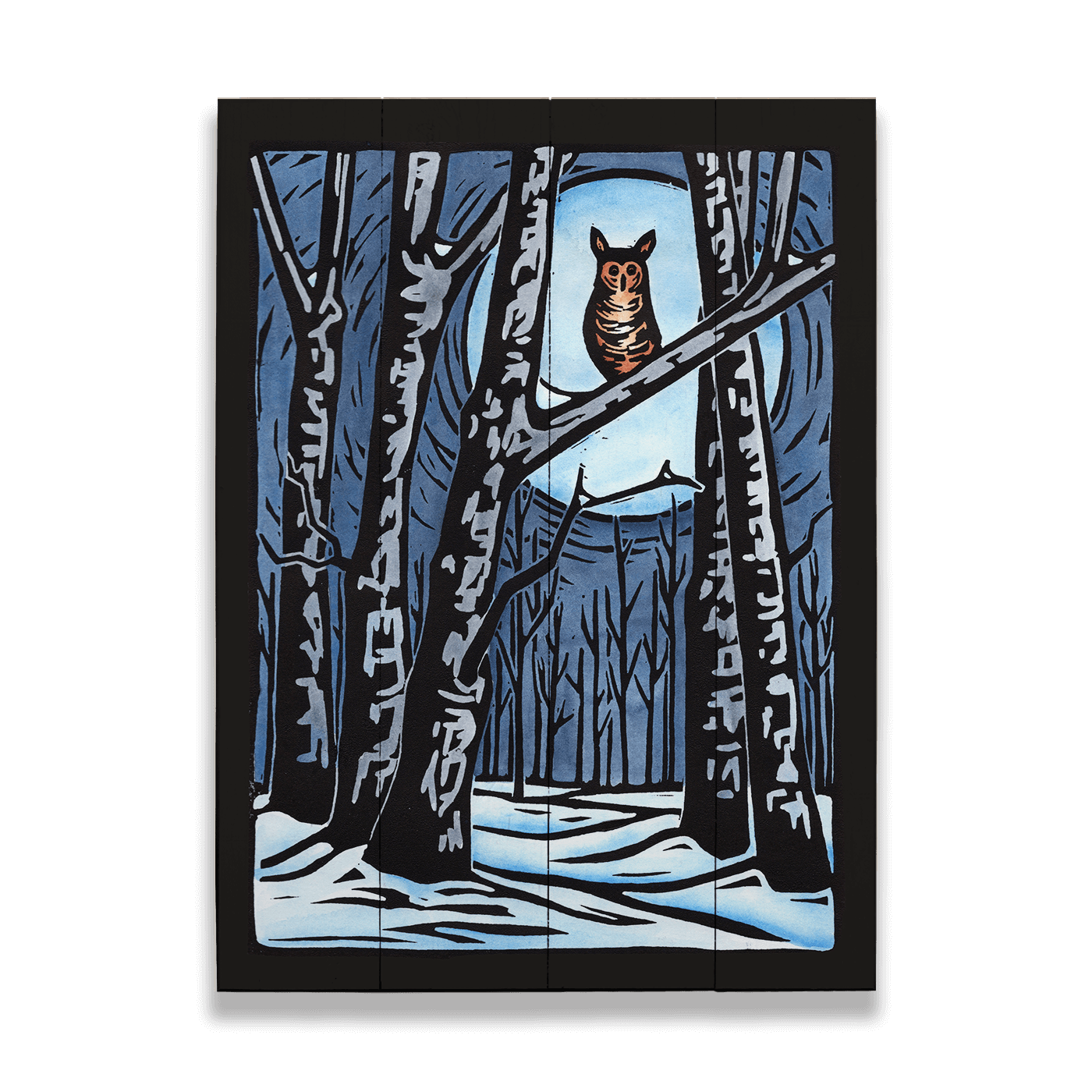 This beautiful artwork captures the quiet mystery of a snowy forest, with an owl perched high on a branch under the glow of a full moon. The bold contrasts of dark tree trunks and cool blue tones create a serene yet intriguing atmosphere, drawing viewers into the stillness of a winter night. Perfect for lovers of wildlife and nature-inspired art, this piece brings the magic of the forest into your space, offering a sense of calm and wonder with every glance.