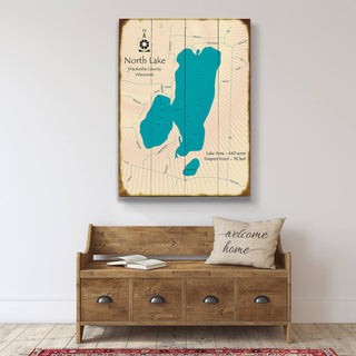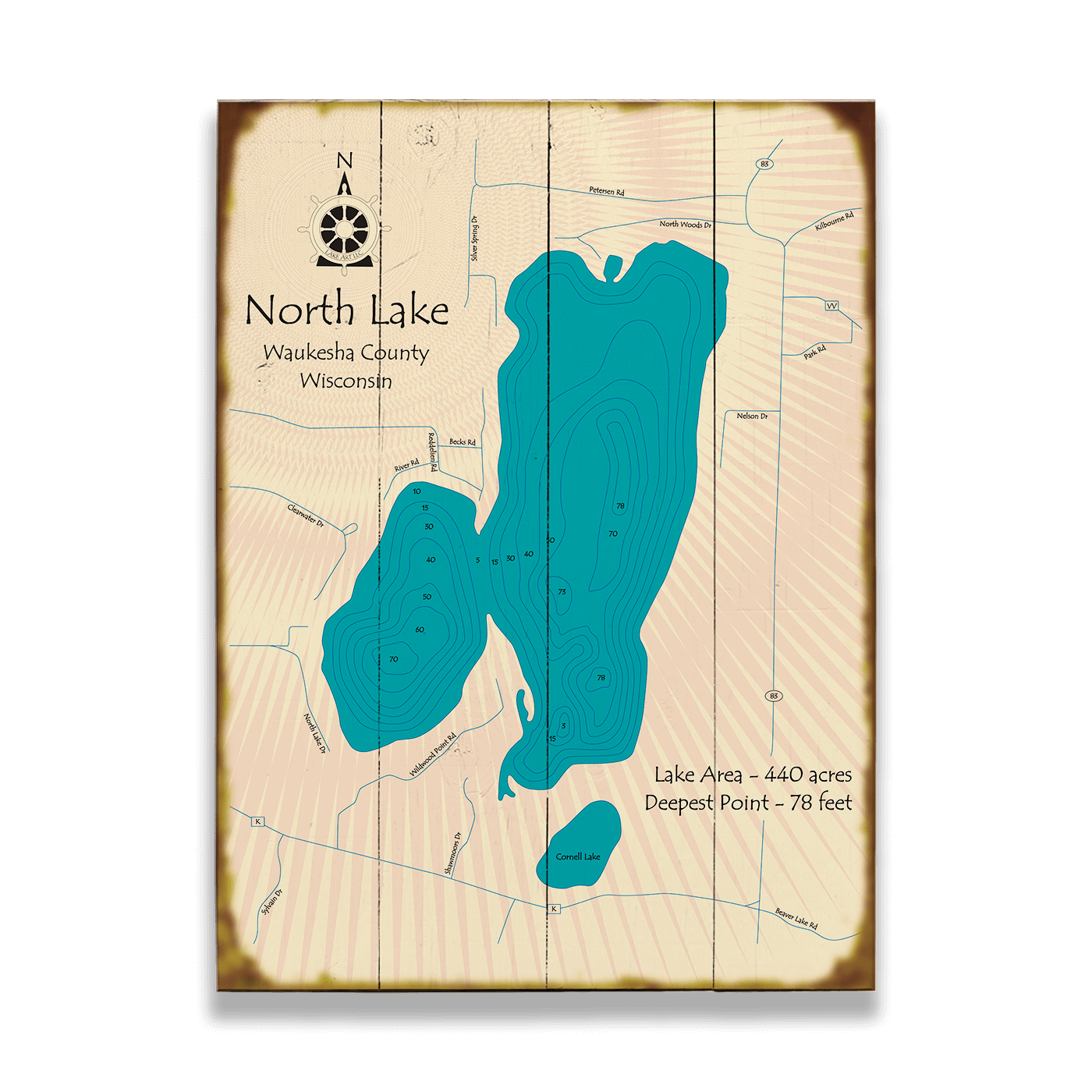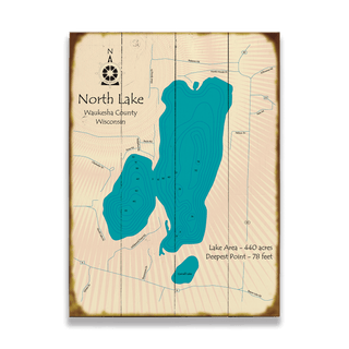 Immerse yourself in the depths of North Lake with this elegant topographic map artwork, a celebration of Waukesha County's natural allure in Wisconsin. Stretching across 440 acres and plunging to depths of 78 feet, North Lake is depicted in rich, contrasting shades, tracing the underwater contours that define this freshwater haven. A destination known for its clear waters and recreational opportunities, North Lake serves as a year-round attraction for anglers, sailors, and nature enthusiasts alike. The precision and artistry of the map make it an ideal decor piece for those who cherish the tranquility of lake life and the rustic charm of Wisconsin's landscapes.