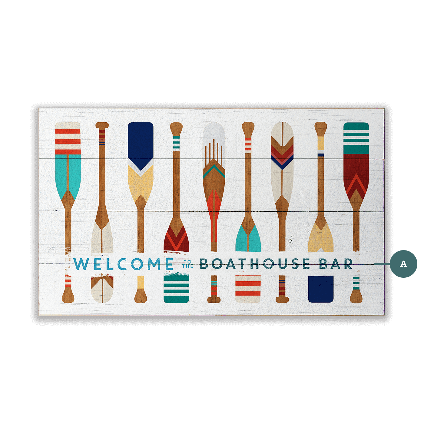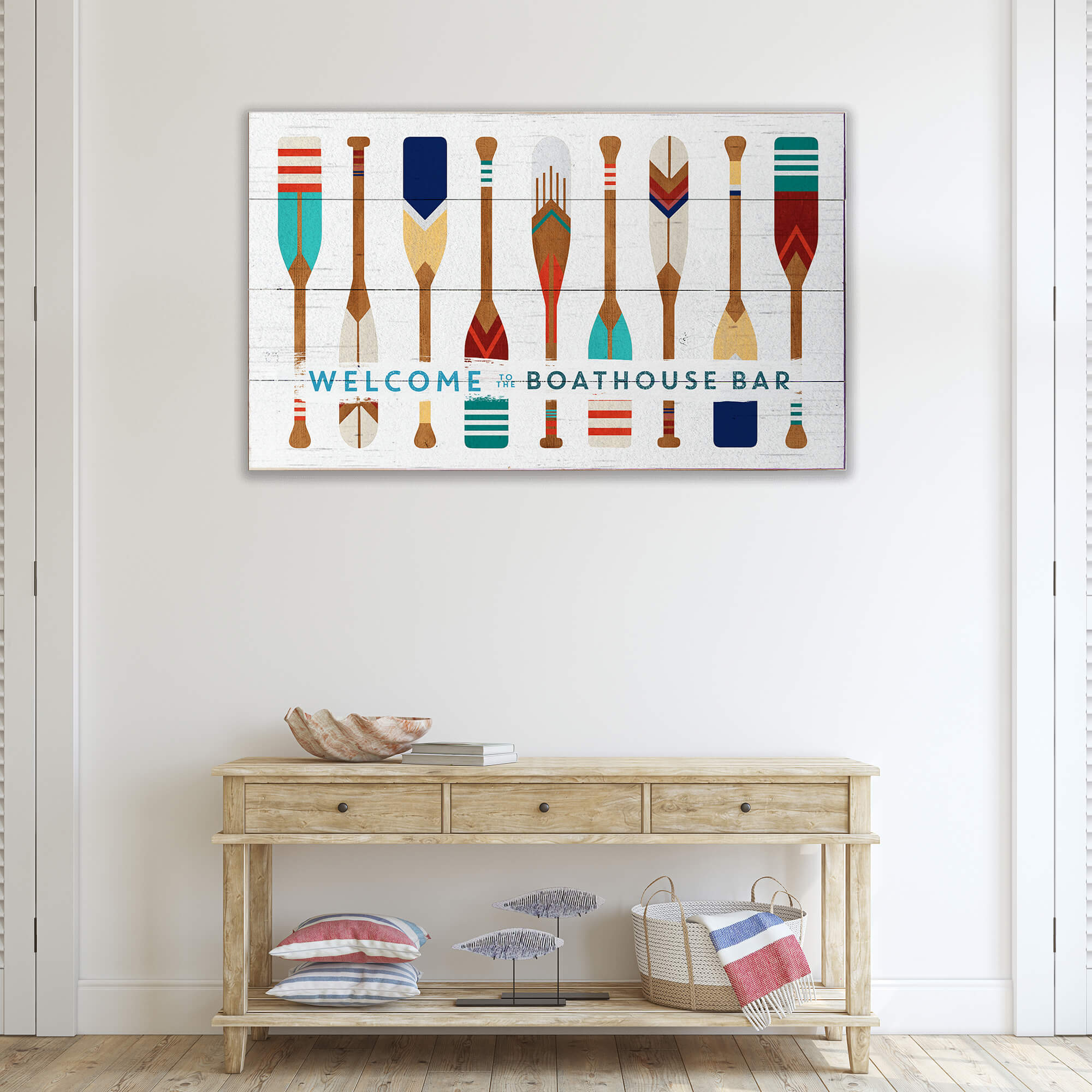 This vintage-inspired "Welcome to Boathouse Bar" art piece features a charming array of paddles in various designs and colors, each paddle bringing its unique flair to this nautical-themed decor. Perfect for enhancing a beach house, boathouse, or any seaside bar, this artwork combines rustic appeal with a touch of elegance. The diversity in paddle designs makes this piece a captivating focal point, inviting guests to immerse in a maritime ambiance.