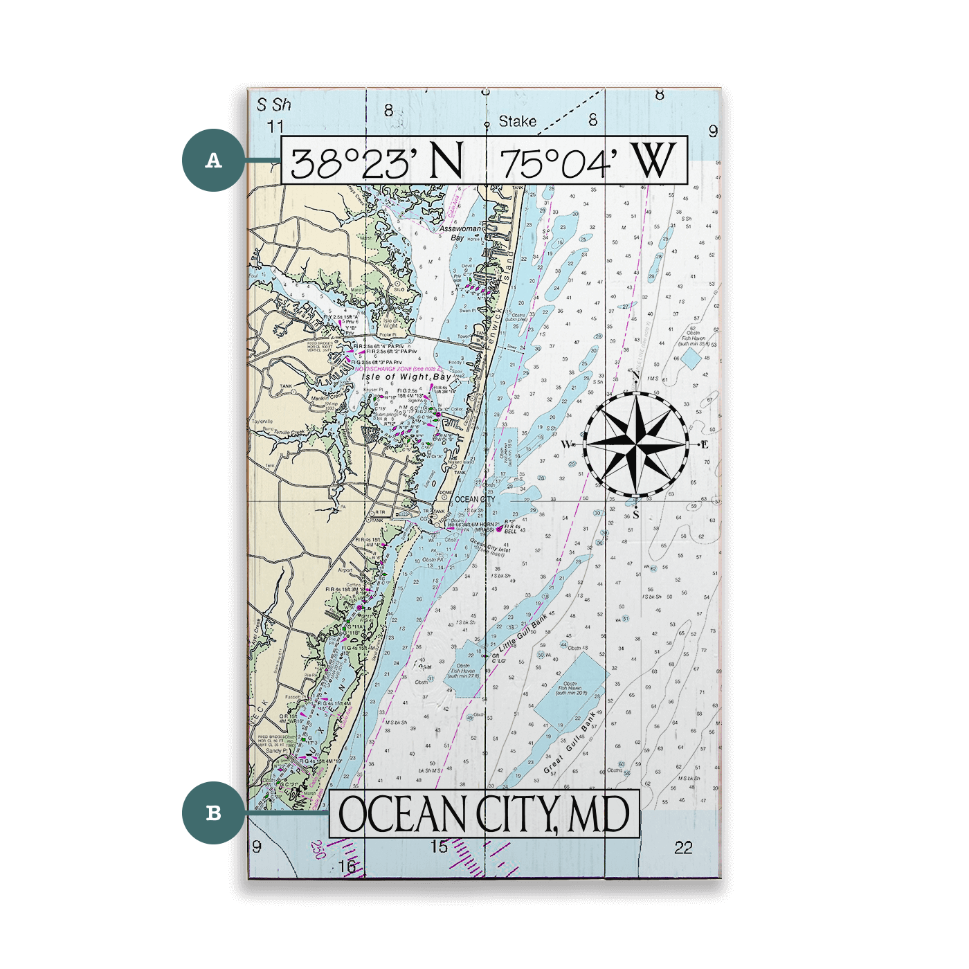 This nautical chart of Ocean City, Maryland, brings the Eastern Shore’s signature coastline to life, from the protected waters of Isle of Wight Bay to the open expanse of the Atlantic. A longtime hub for beachgoers, anglers, and boaters, Ocean City is known for its iconic boardwalk, thriving charter fleet, and vibrant seasonal energy. The chart reveals marked fishing grounds, navigation channels, and barrier island geography that shape both recreation and commerce in the region. With customizable coordinates and title, it’s a distinctive way to honor a destination where summer traditions and coastal heritage run side by side.