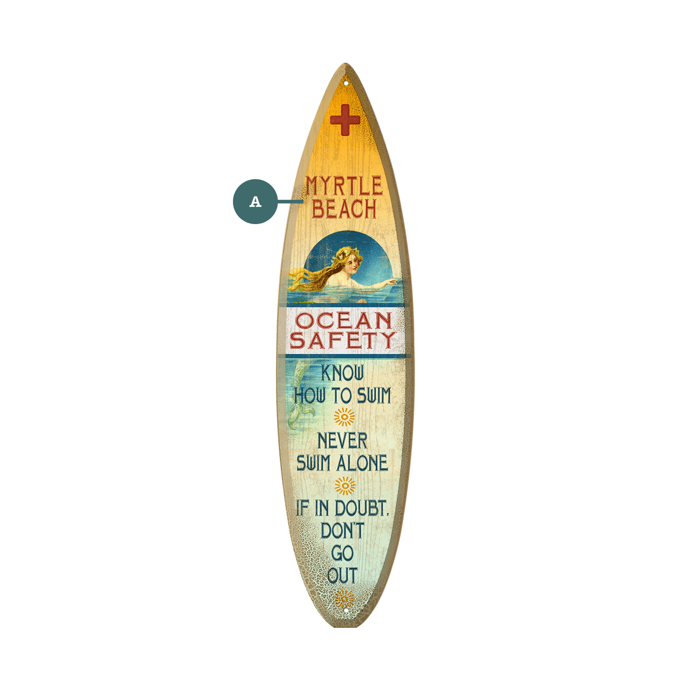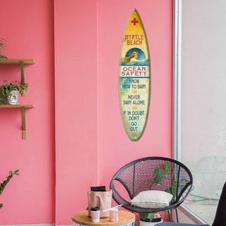 Add a coastal touch to your décor with this surfboard wall art, crafted from wood and printed with a vintage-inspired ocean safety design. Featuring a classic lifeguard-style theme with a nostalgic beach aesthetic, this decorative surfboard sign is perfect for bringing a seaside vibe to any space. Whether for a beach house, surf shack, or nautical-themed room, this unique wooden wall art makes a great statement piece.