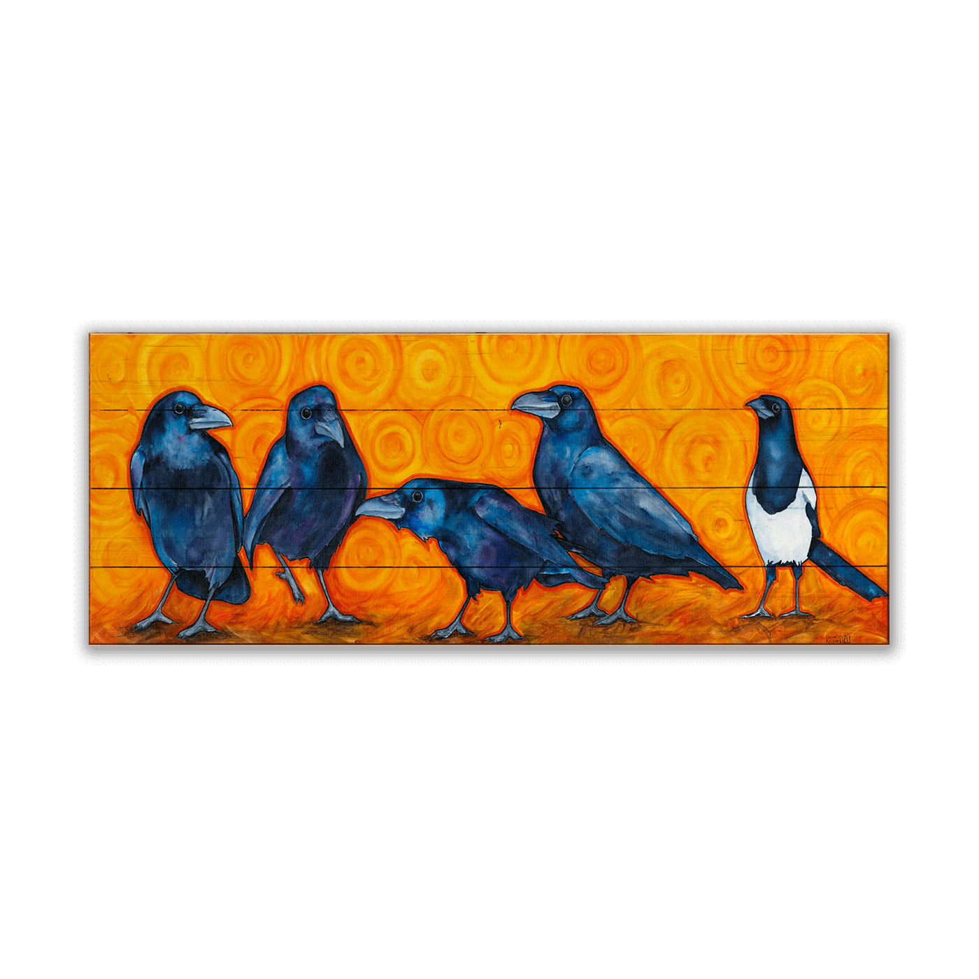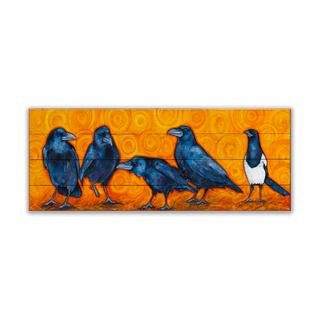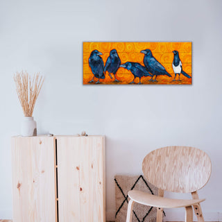 Celebrate the quirky charm of corvids with this captivating artwork featuring a group of deep blue crows alongside a striking black-and-white magpie. Set against a warm, swirling golden-orange backdrop, this piece exudes energy, intrigue, and personality. Add a bold and whimsical touch to your space with this playful yet sophisticated piece, perfect for bird enthusiasts or anyone who loves unique, expressive art.