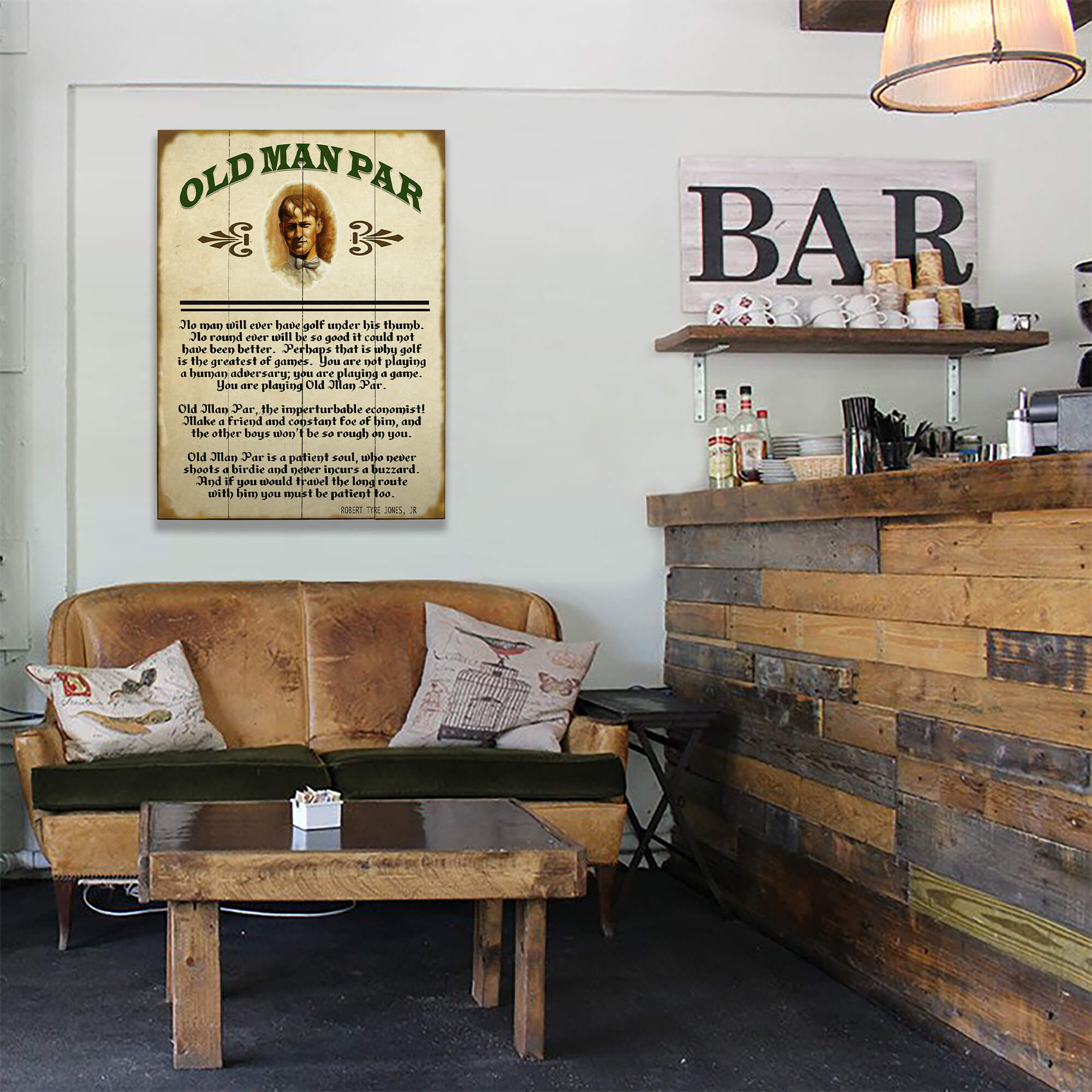 This evocative vintage poster titled "Old Man Par" features a classic quote from legendary golfer Robert Tyre Jones Jr., reflecting on the philosophical nature of golf. The artwork showcases a stately portrait of an older man, symbolizing the persona of 'Old Man Par,' surrounded by an old-world design that captures the enduring spirit and mental challenge of the game. The text eloquently expresses the idea that in golf, one is not just playing against opponents but against the par score of the course itself, making the game a timeless quest for personal excellence. This piece is perfect for anyone who appreciates the deeper life lessons golf teaches, making it a thoughtful addition to any golfer's home or clubhouse.