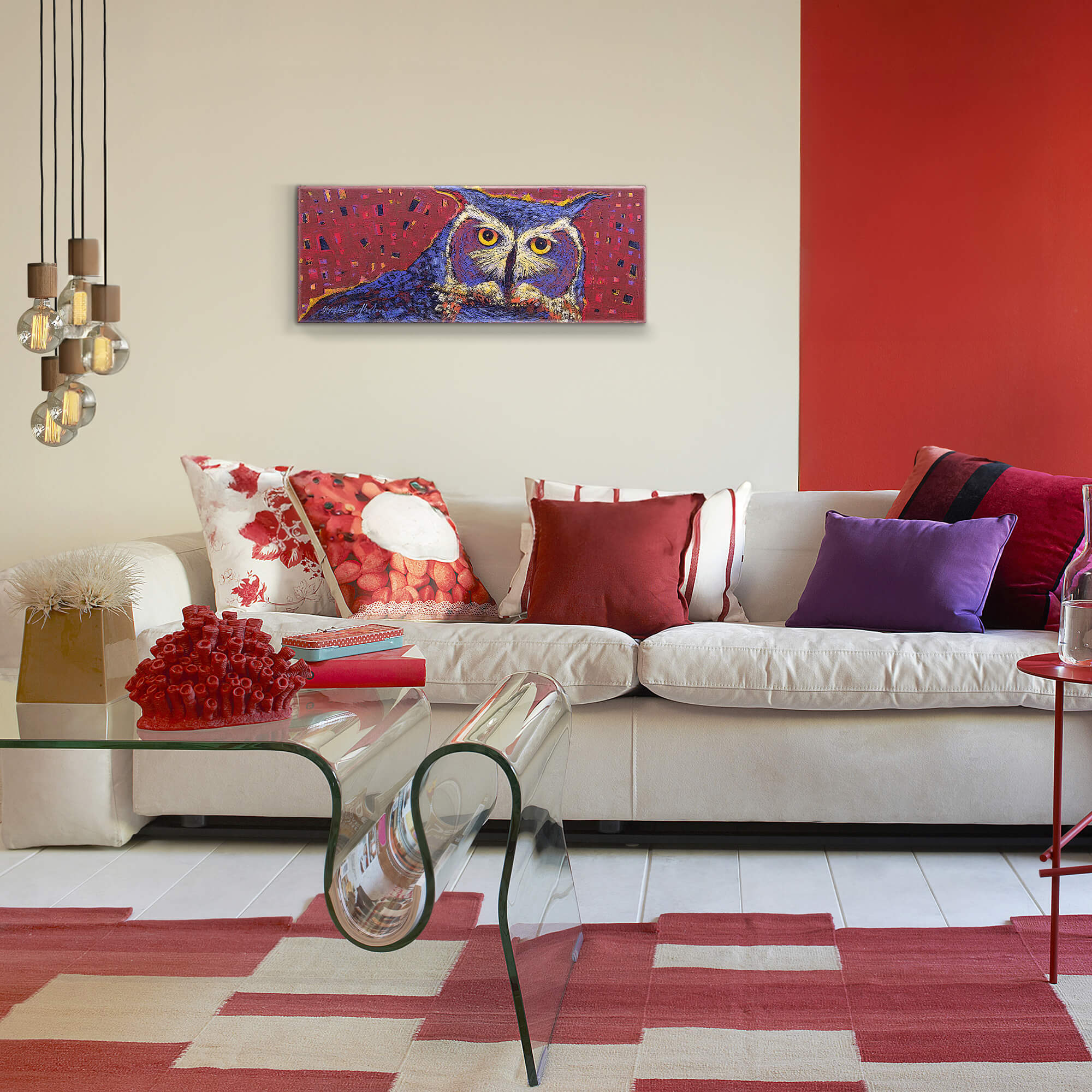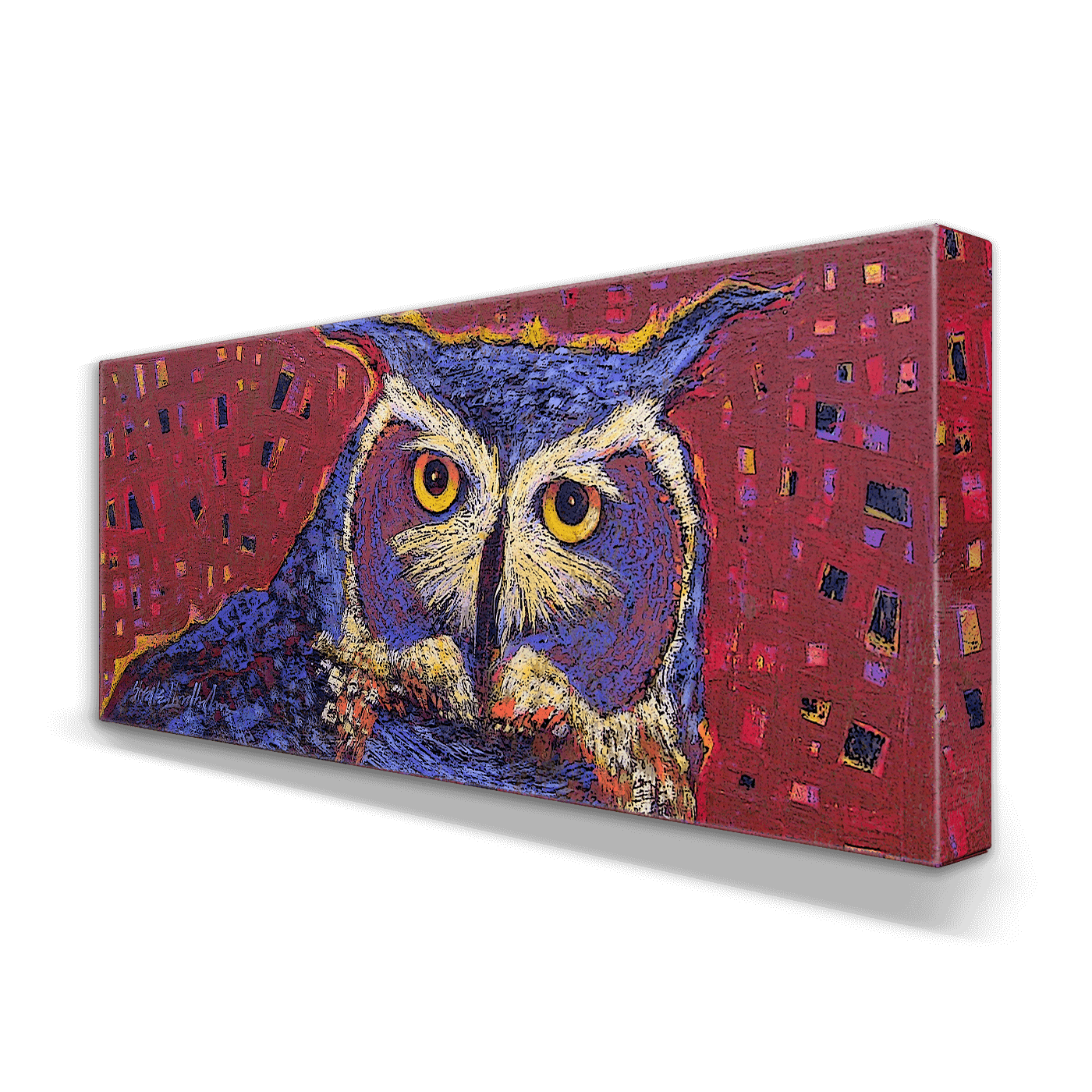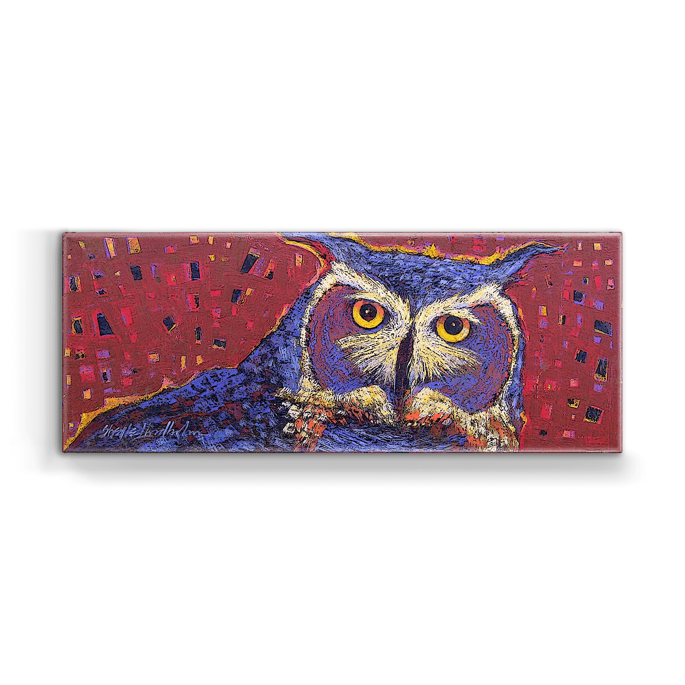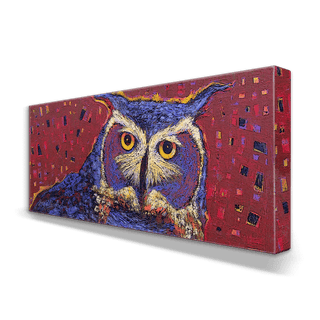 This captivating artwork of a great horned owl brings a sense of mystery and wisdom to life. The intricate details of the owl’s intense gaze and striking plumage are accentuated by a rich, textured background in vibrant red with hints of gold and purple. The geometric patterns and bold brushstrokes add a modern flair, while the deep, watchful eyes of the owl draw the viewer in. Perfect for creating a dramatic focal point, this piece combines natural beauty with artistic boldness, celebrating the majestic and enigmatic spirit of the owl.