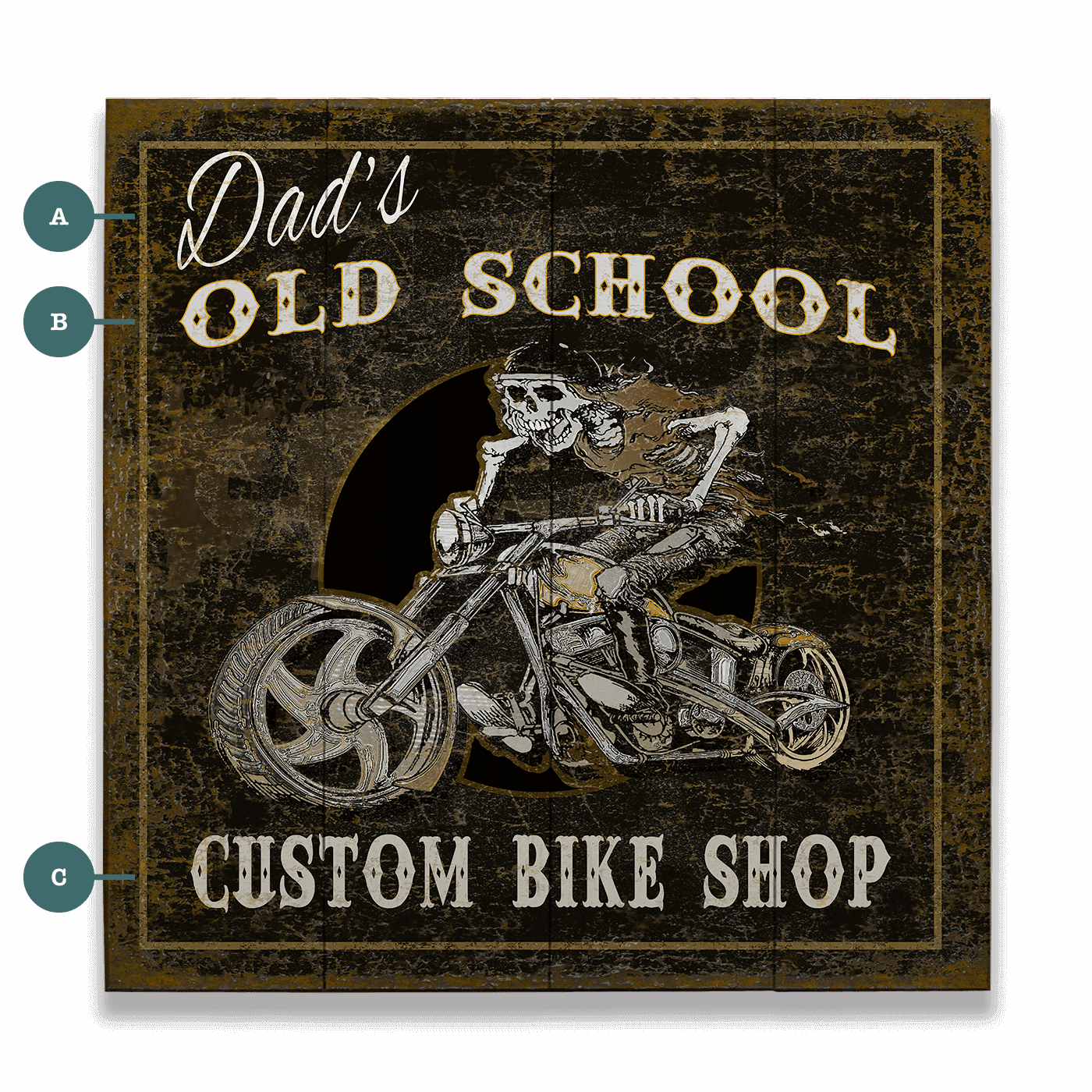 Dive into the world of classic motorcycle culture with our "Old School Custom Bike Shop" poster. This striking artwork features a skeletal rider on a vintage motorcycle, embodying the rebel spirit and timeless appeal of custom bike craftsmanship. The gritty, dark background and golden lettering enhance the poster's edgy, rugged feel, making it a perfect addition to any biker enthusiast’s collection or motorcycle shop decor.