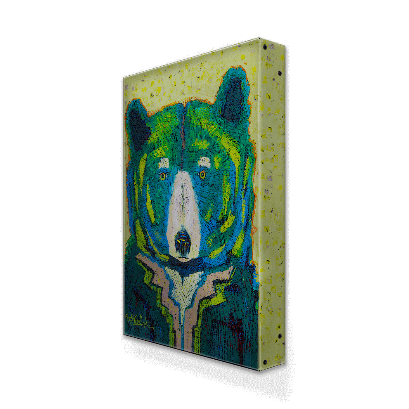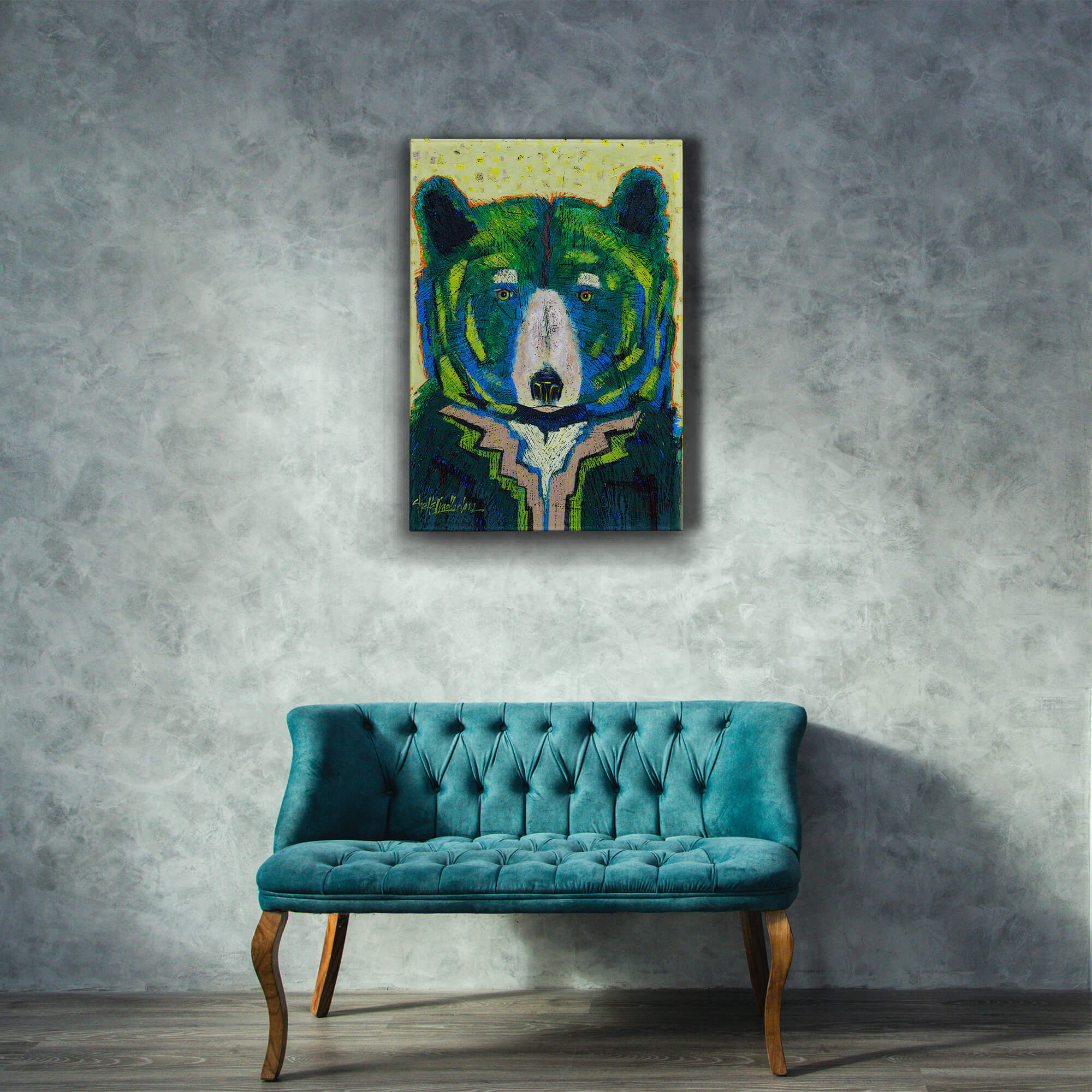 Experience the mesmerizing allure of "Olympia," a captivating bear portrait that blends rich hues of blue and green to create a stunning visual symphony. This artwork features intricate patterns and deep, resonant colors that evoke the essence of the natural world, symbolizing strength and tranquility. The bear's intense gaze is rendered with a mastery that draws viewers into a deep, contemplative state, making it a profound addition to any art collection. Ideal for those who cherish artworks that convey depth and emotion, "Olympia" enhances any space with its powerful presence and artistic intricacy.
